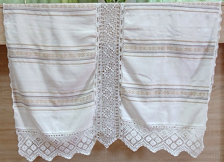 Țesut la război cu dungi decorative, îmbinare prin inserție centrală de dantelă croșetată manual; margini finisate cu bordură lată de dantelă croșetată cu motiv |