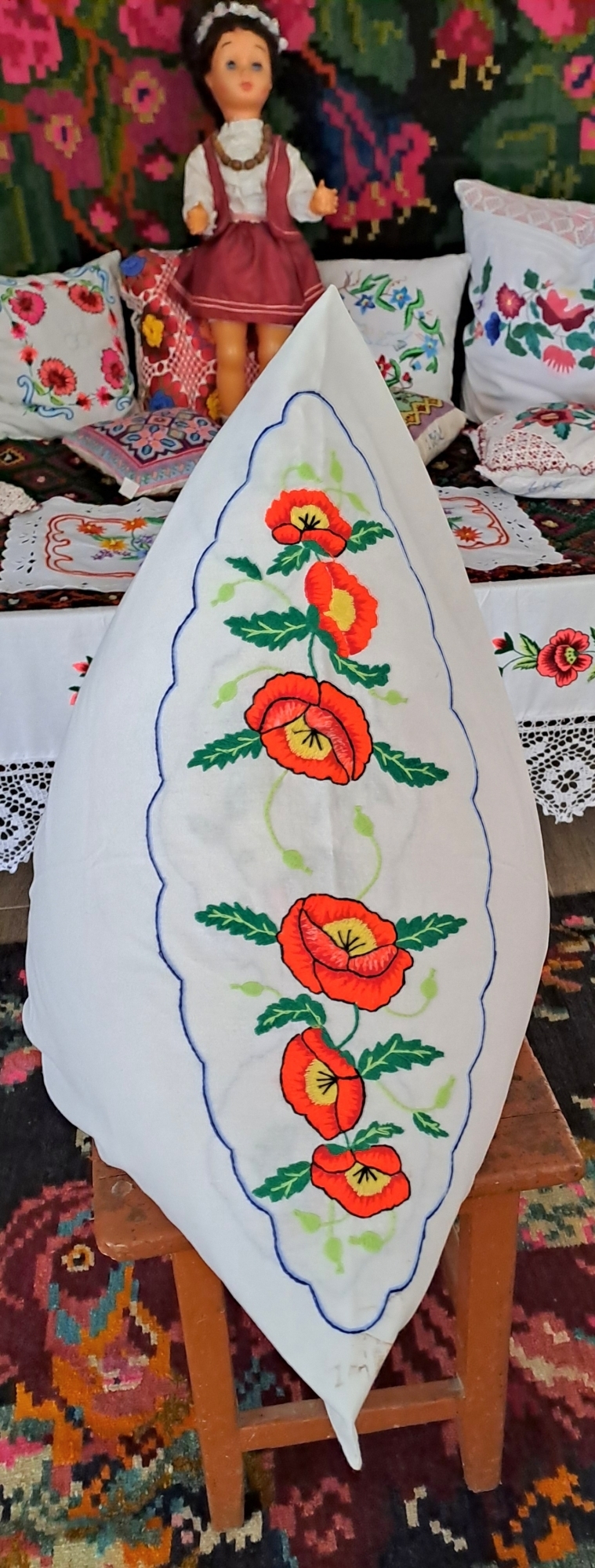 Piesă de formă dreptunghiulară, din pânză de bumbac, albă cu deschis brodat cu ornament floral și geometric. Decorul format din două buchete a câte 3 flori de mac înconjurate de chenar . Cromatică; nuanțe de verde, roș, roz, galben, vișiniu, negru, veolet.