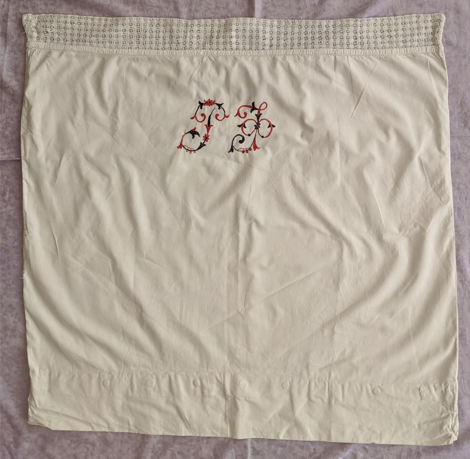 Față de pernă de culoarea albă cu forma pătrată. În partea de sus este situată o dantelă cu lățimea de 13 cm, croșetată manual din fire de ațe de bumbac. Dantela are un decor floral pe toată suprafața și este prinsă de ambele laturi ale feței de pernă cu o fâșie îngustă din pânză albă cusută la masina de cusut. Pe fața de pernă mai jos de dantelă sunt cusute inițialele soțului și soției: Raisa și Fiodor: ,,R și F”. Literele sunt cusute și ajurate cu floricele și frunze din ață roșie și neagră. Partea de jos este îndoită și prinsă manual.