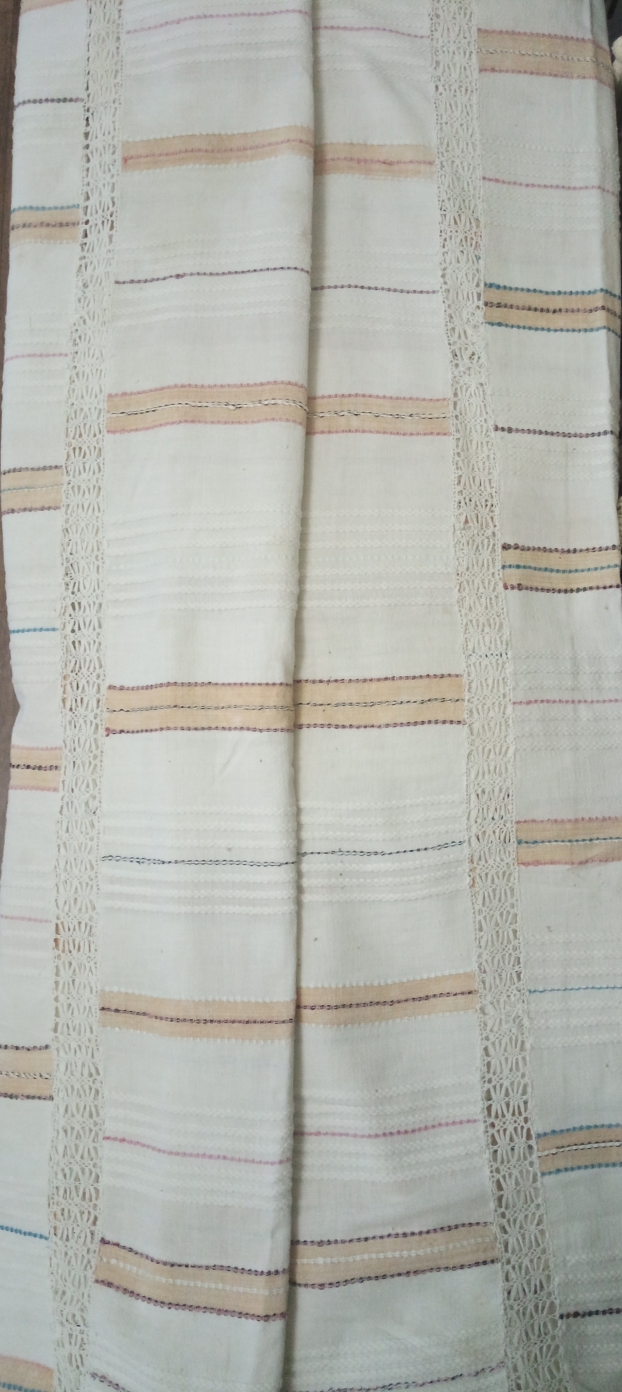Țesută în condiții casnice, în stative orizontale, forma dreptunghiulară, din pânză de in, fiind alcătuită din trei bucăți, pe câmpul cărora sunt brodate fâșii de culoare bej (pielea cucoanei), separate în două bucăți, fiind brodate marginile la toate laturile cu rând- lănțișor din fire policrome și între aceste fâșii sunt vrâste brodate câte 7 rânduri cu fire albe. Între bucățile de pânză sunt cusute două dantele (horboțele) croșetate fin cu acul, cu elemente geometrizante și florale.