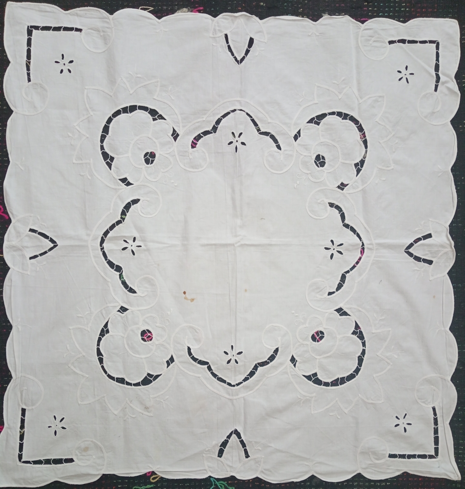 Forma pătrată, pânza de hasa, culoare albă. La toate patru colțuri și pe mijlocul piesei broderie spartă sub forma unor flori, elemente decorative, ramurele cu frunze, toate cu ață albă, marginea părților laterale festonată.