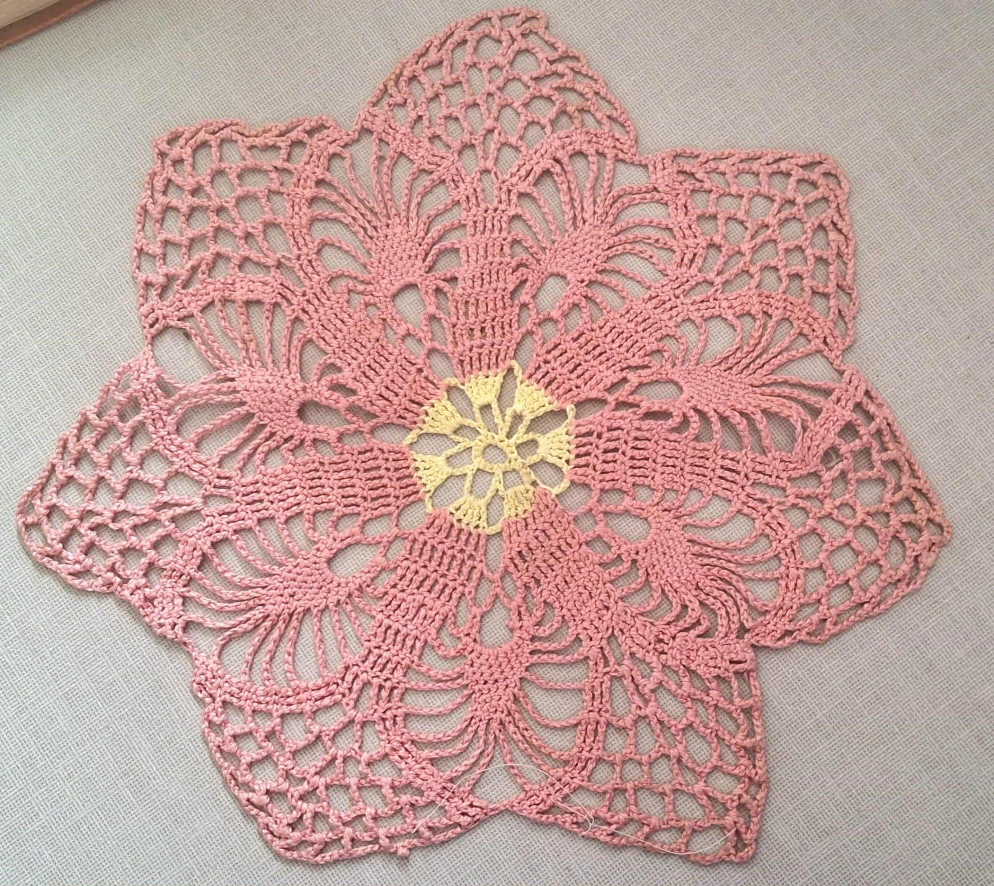 Mileu croșetat manual cu ață din iris roz, doar mijlocul este galben. Este în formă de stea cu 7 raze. Razele seamănă cu o pânză de păiangen. În ea se deslușește o floare cu 7 petale. Petalele putem spune că sunt umplute cu un motiv zoomorf (păiangenul). Pe centru se observă o floare mică.