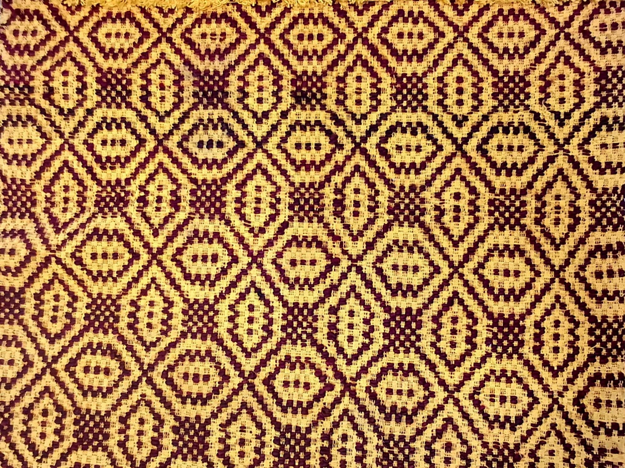 Păretar de tip „macat”. Confecționat în condiții casnice la războiul de țesut orizontal. Urzala este din fir galben de bumbac. Băteala combină fir galben de bumbac cu fir de lână gros, vișiniu.
