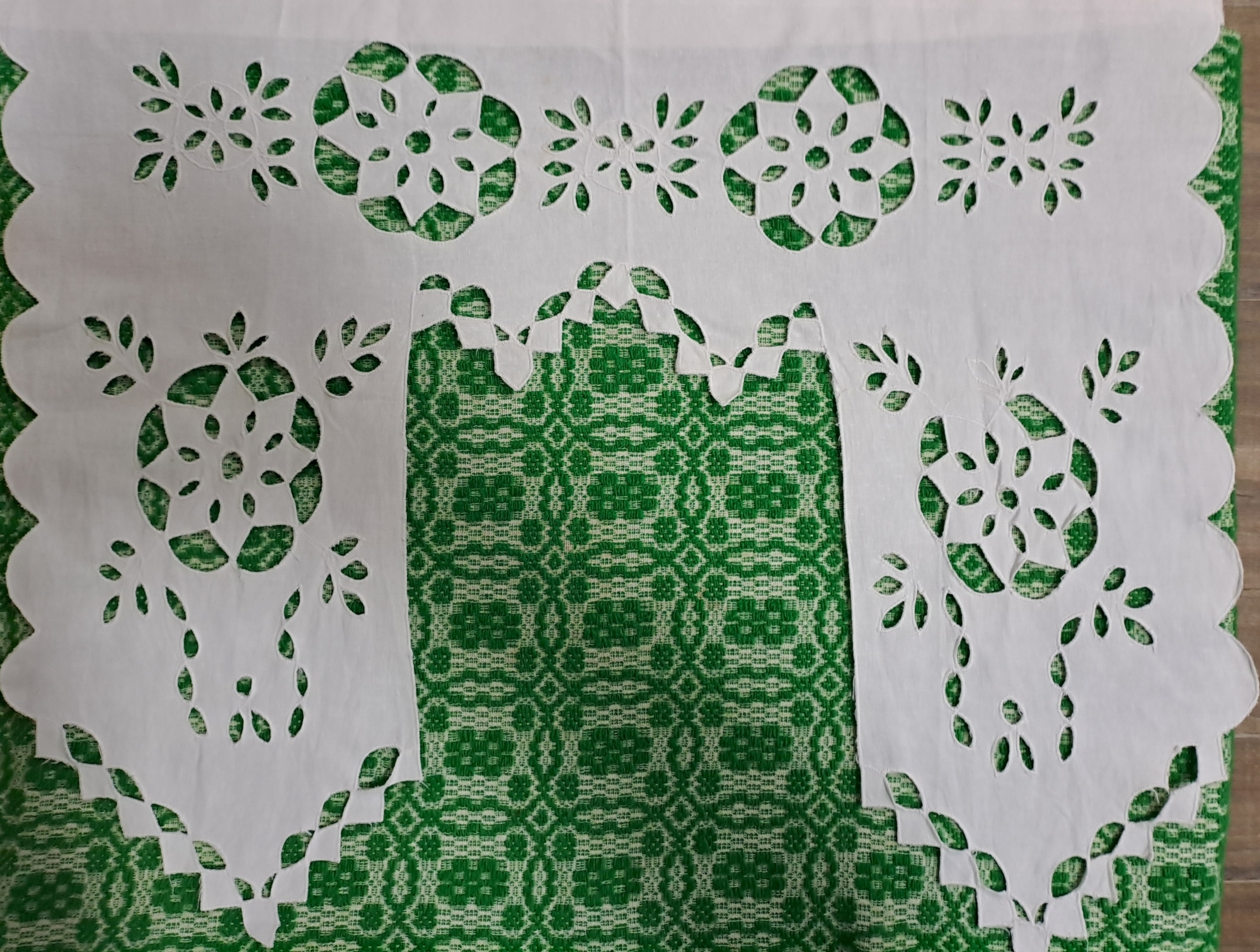 Piesă de culoare albă brodată tehnic, motive ornamentale florale. Partea de jos se compune din colțuri la mijloc mai scurte , în părți mai lungi. Cromatică; alb.