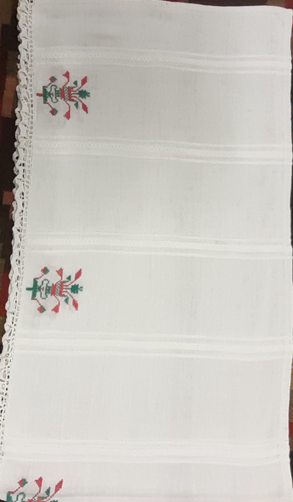 Perdea confecționată din pânză de bumbac țesut în două ițe,vrâstată cu vrâste pe tot parcursul cu tiriplic,brodată în tehnica cruciuliță obligă,motiv floral;cromatica:-roșu,verde;croșetată marginea.