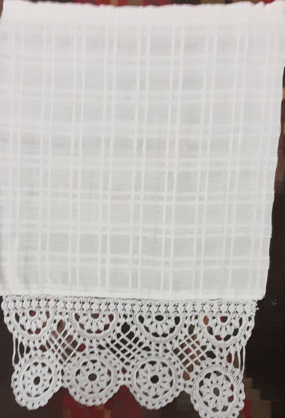 Pierdea confecționată din bumbac țesut în cadril, croșetată la margină:două rânduri de patru rozete și patru semi-rozete,unite între ele prin câte opt dungi croșetate în formă de cruceX-LA-20cm.