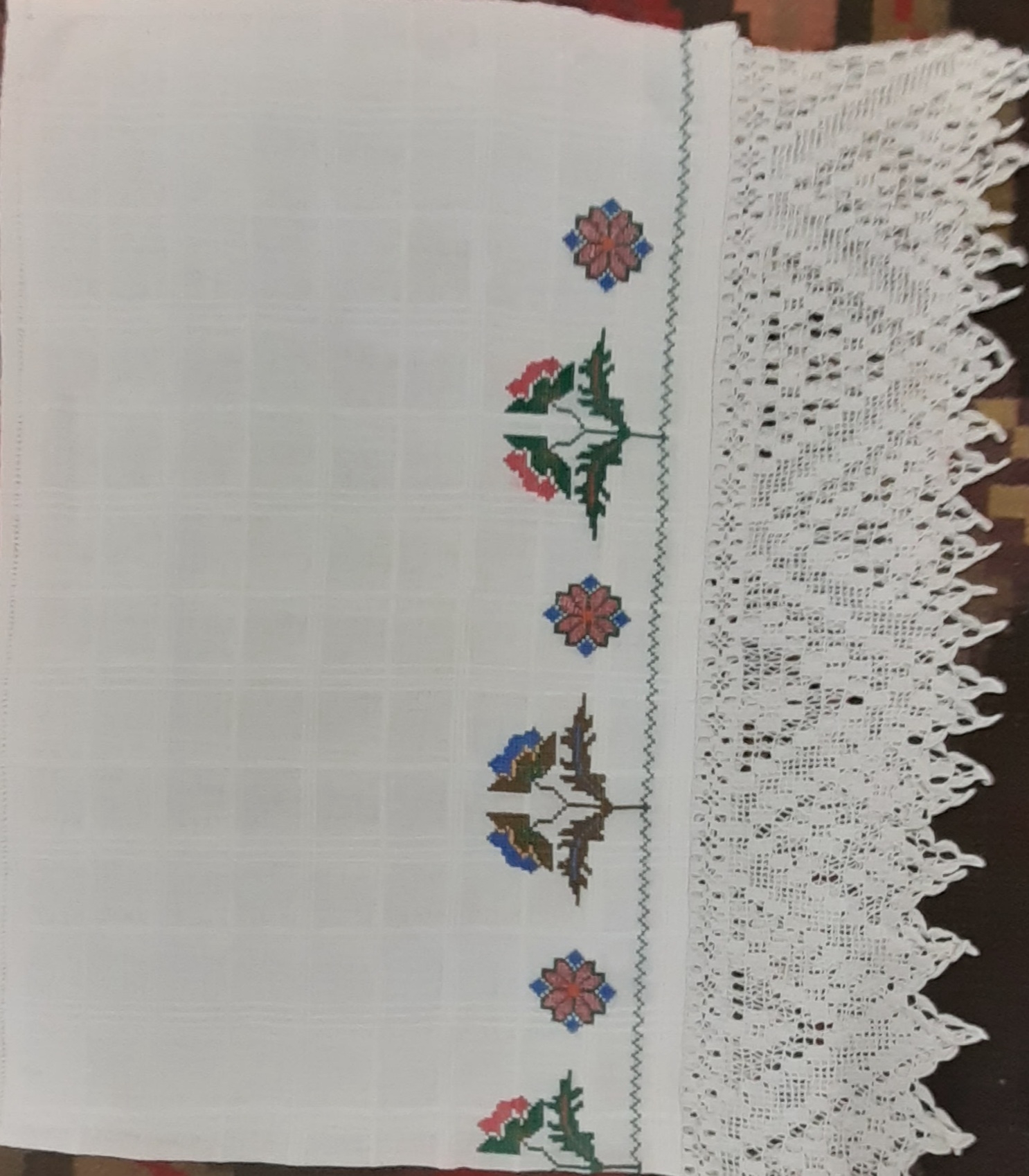 Perdea confecționată din pânză de casă,țesută în cadril cu registre vertical și orizontal diferite,brodată în tehnica cruciuliță obligă,motiv floral-cinci crenguțe de trandafir pe un câmp verde și șase romanițe;cromatica:verde,roz,albastru,maro; croșetată la margini cu dantelă în colțuri în tehnica filet,motiv geomorf.