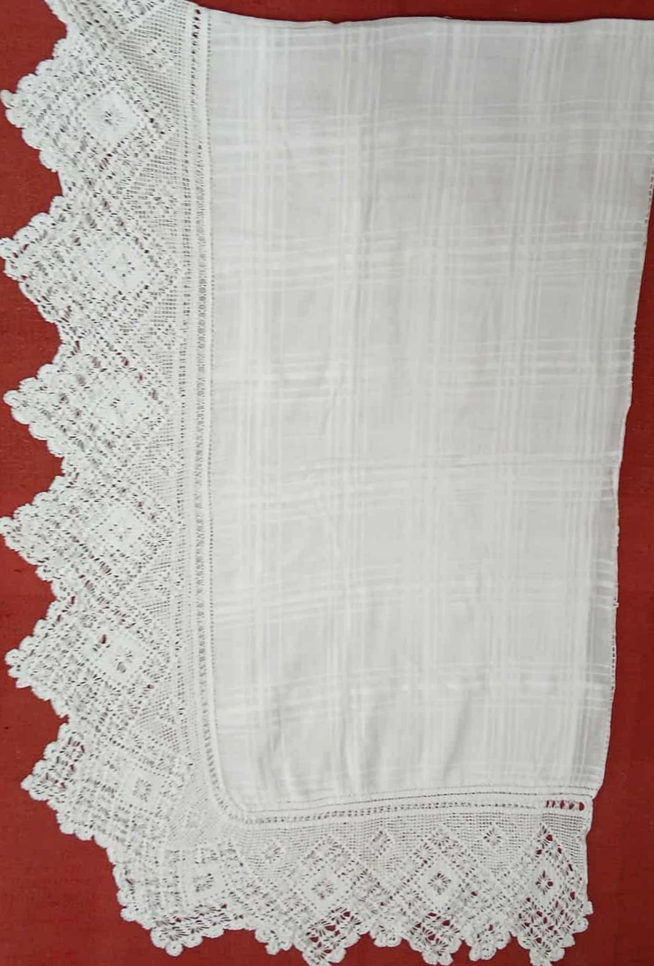 Tehnică | Țesătură mecanică sau manuală cu model discret în carouri (prin alternarea firelor) Dantelă croșetată aplicată manual pe margini. |