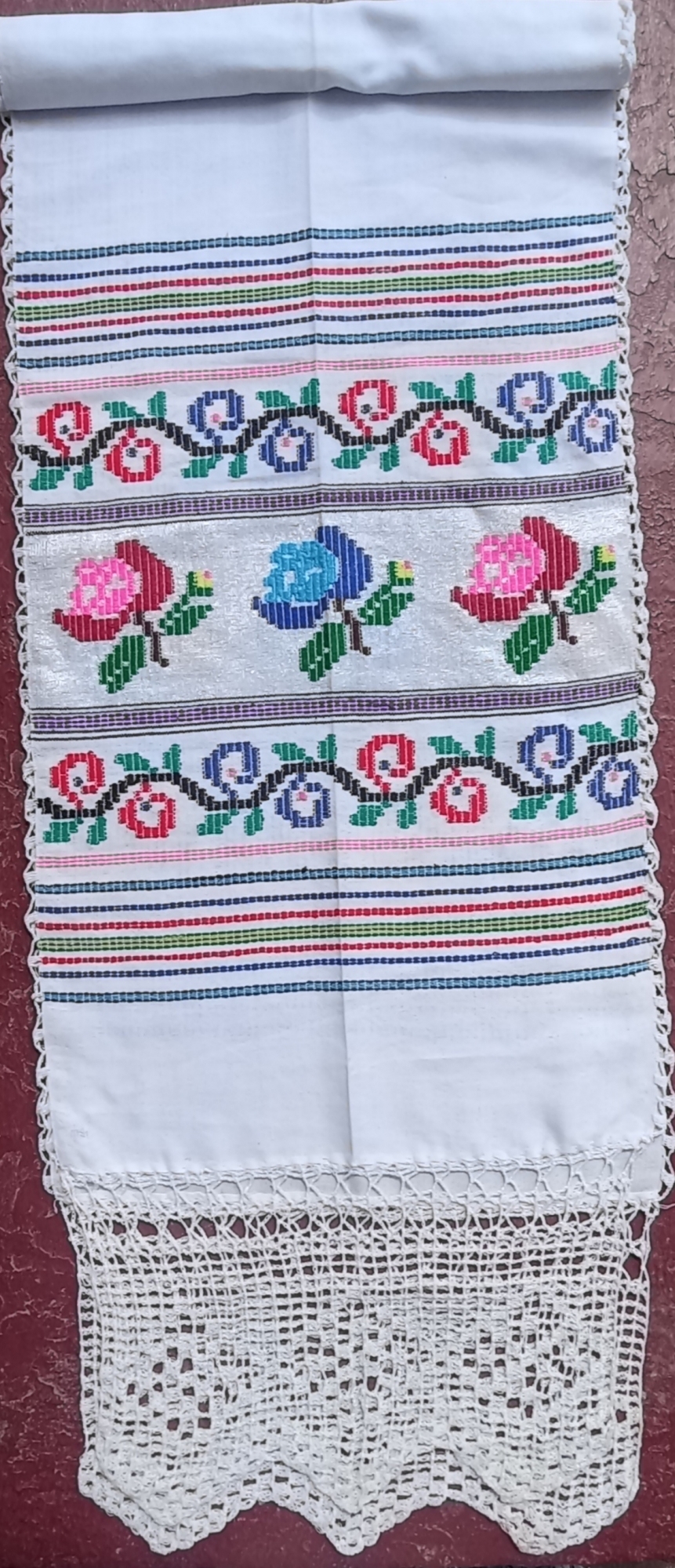 Țesut în război orizontal (stative), forma dreptunghiulară, din pînză de culoare alba, urzeala și băteala din bumbac. Este brodat spre capete în două registre late cu vrâste policrome, având motivul ,,panglică de lănțișoare", între care sunt brodate alte două registre înguste din trei vrâste lănțișor, după care urmează câte o ramură vegetal florală. Iarăși urmează câte un registru din rânduri în două culori, negru și move, iar în mijloc, pe pânza țesută cu fire argintii, este un rând de flori stilizate - trandafirul.