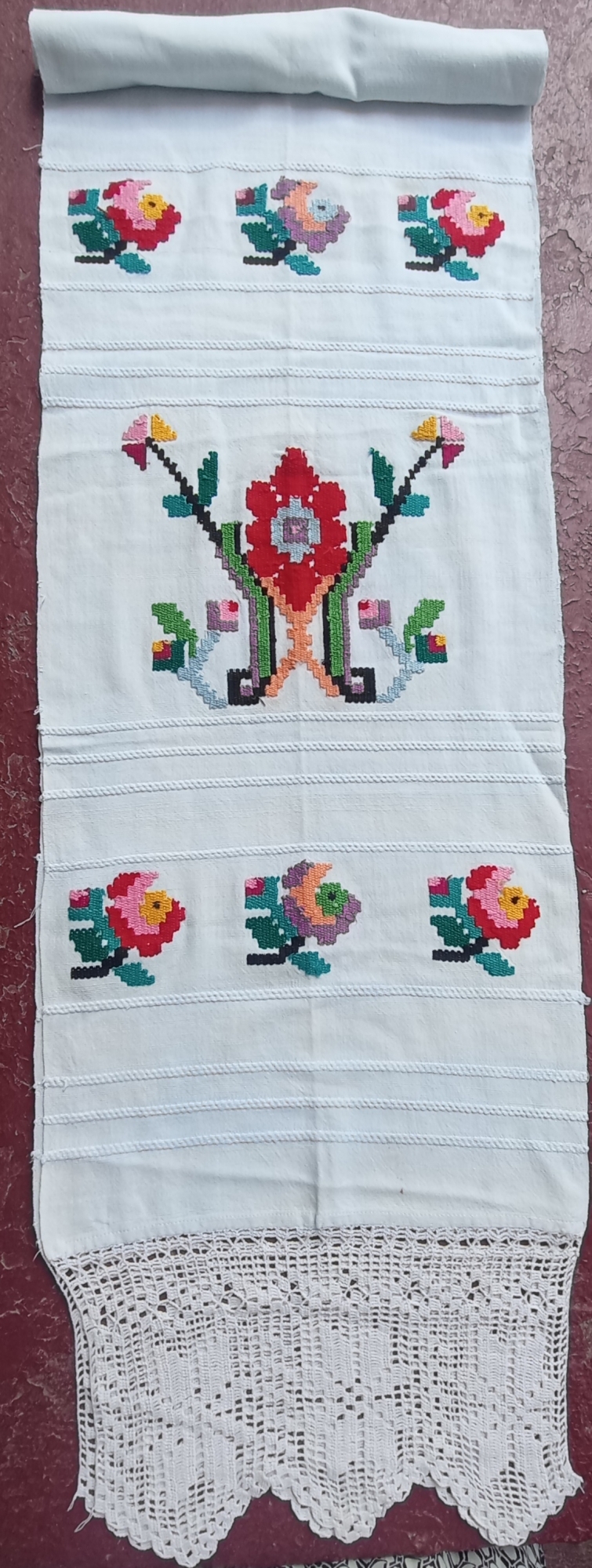 Țesut în război orizontal (stative), forma dreptunghiulară, din pînză de culoare alba, urzeala și băteala din bumbac. Este brodat spre capete în pânză cu câte un rând de ață albă sub forma unui lănțișor. În mijloc, între rândurile albe, sunt brodate două rânduri cu elementul ,,trandafirul stilizat" (câte trei trandafiri pe fiecare rând) și, după iarăși câteva rânduri brodate de culoare albă, un ornament cu motivul ,,ramuri fitomorfe" și în mijloc o floare.