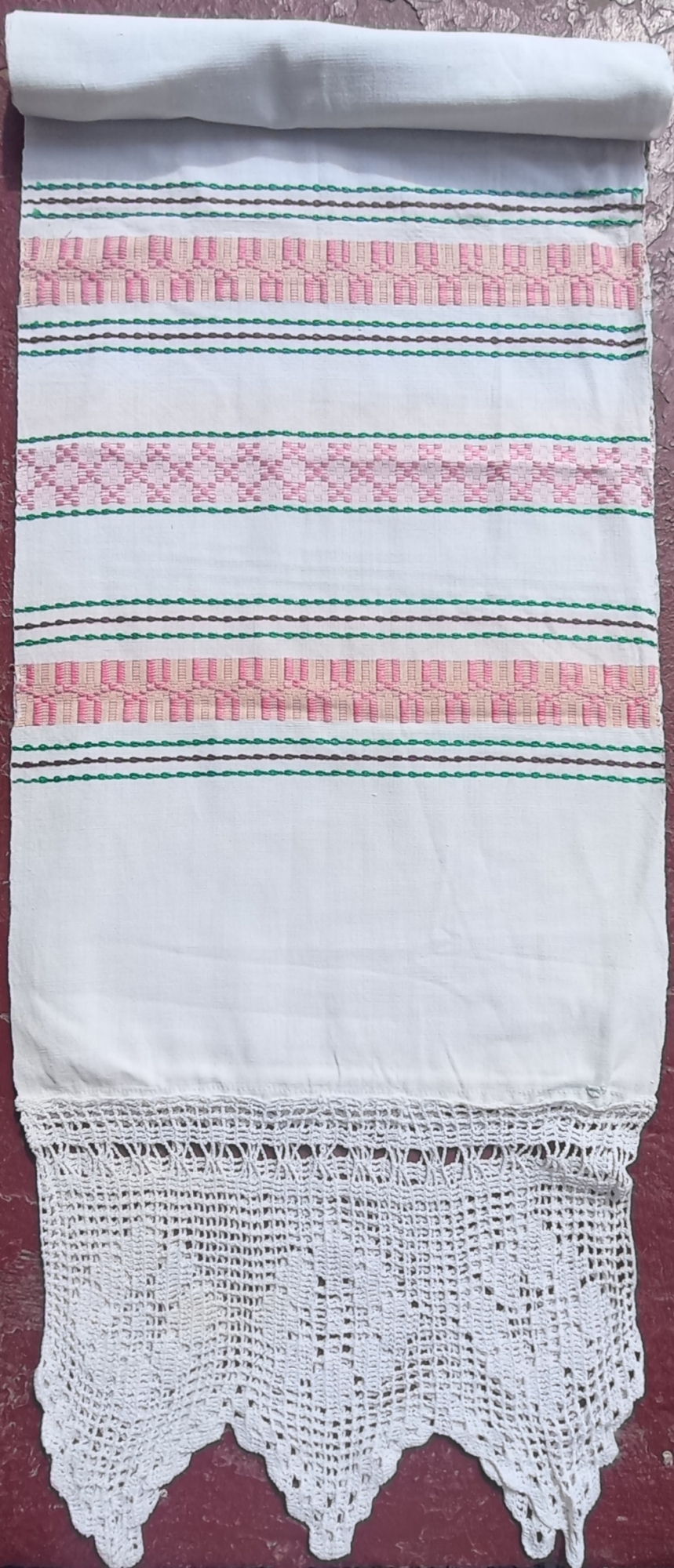 Țesut în război orizontal (stative), forma dreptunghiulară, din pînză de culoare alba, urzeala și băteala din bumbac. Este brodat spre capete în vrâste policrome, cu elementele - lănțișorul, printre ele fiind fâșii cu motivele ,,ghirlanda" și, în mijloc, motivul ,,rombului stilizat".