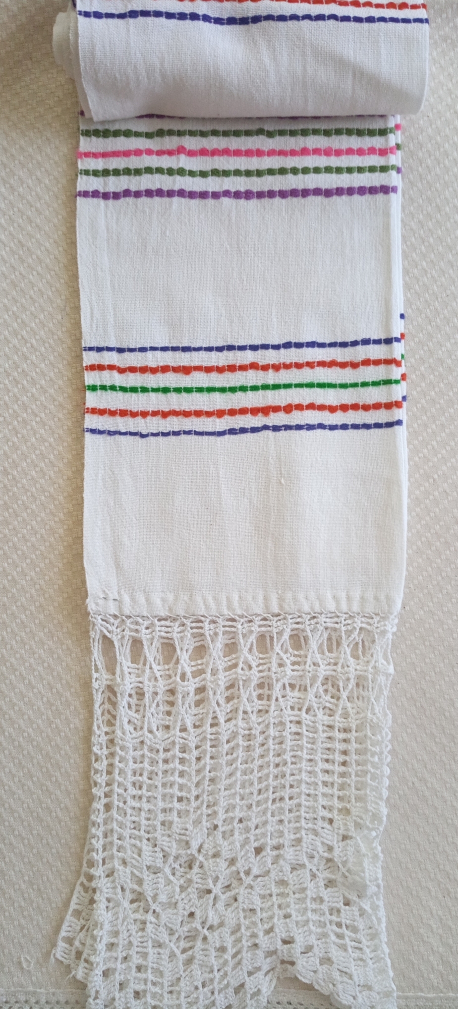 Țesut în război orizontal (stative), forma dreptunghiulară, din pînză de culoare alba, urzeala și băteala din bumbac. Este brodat spre capete în 3 registre din vrâste de culori policrome - puncte.