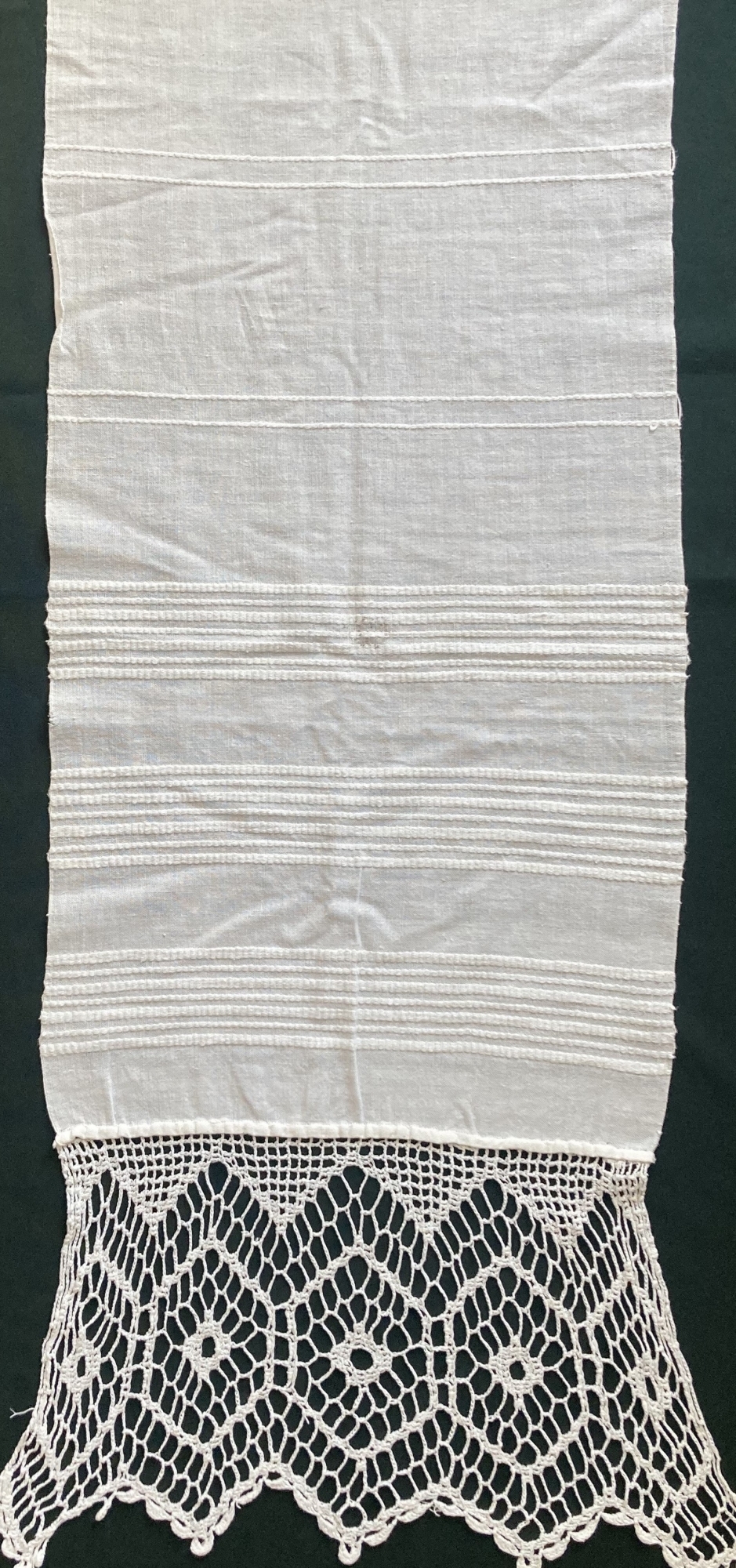 Prosop. Piesa țesută în stative, confecționată din bumbac. Pe câmpul central al piesei: 8 perechi de vrâste, dispuse paralel cu lățimea piesei. Spre fiecare capăt latitudinal al piesei: câte 3 grupuri de vrâste a câte 7 vrâste în fiecare grup, de diferite lățimi, țesute reliefat. La fiecare capăt latitudinal al piesei: dantelă confecționată manual la croșetă. Pe dantelă: ornament vegetal geometrizat.