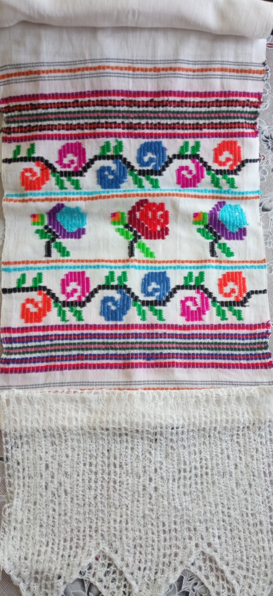 Țesut în război orizontal (stative), forma dreptunghiulară, din pînză de culoare alba, urzeala și băteala din bumbac. Este țesut în pânză cu câte două registre a câte două fire de culoare gri, între cvare e brodat un rând culoare portocalie, apoi brodat spre ambele capete în registre din rânduri policrome, cele de pe mijloc având marginile brodate cu culoare neagră. Între registre sunt două fâșii cu motivul ,,ghirlandă cu flori stilizate″- curbeci, iar în mijloc o fâșie cu motivul ,, flori stilizate″ - trandafirul înfllorit .