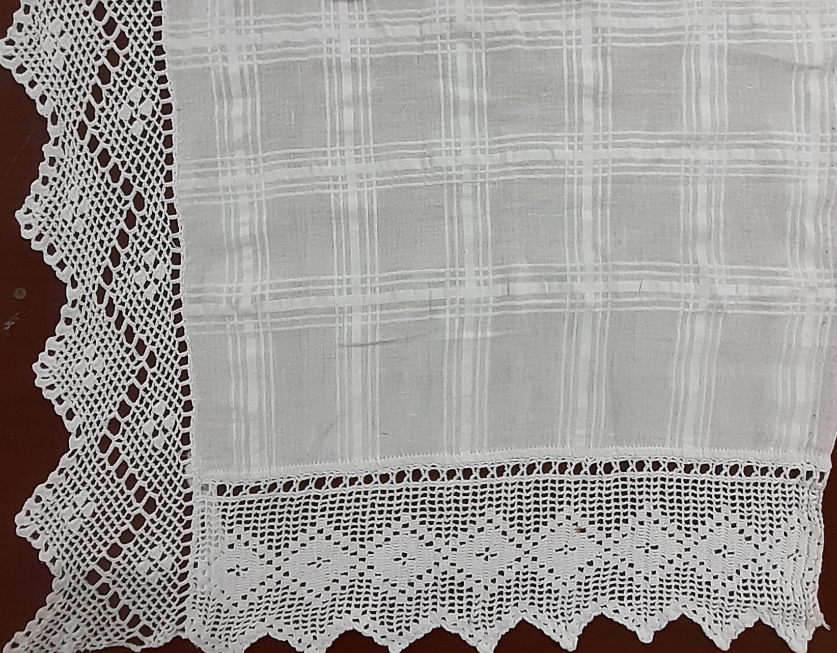 Prosop de bumbac vechi,țesut în cadril cu același registru vertical și orizontal,fără margini evidențiate,croșetat la capete și la o coastă cu dantelă în colțuri în tehnica filet, cu motive geometice diferite.