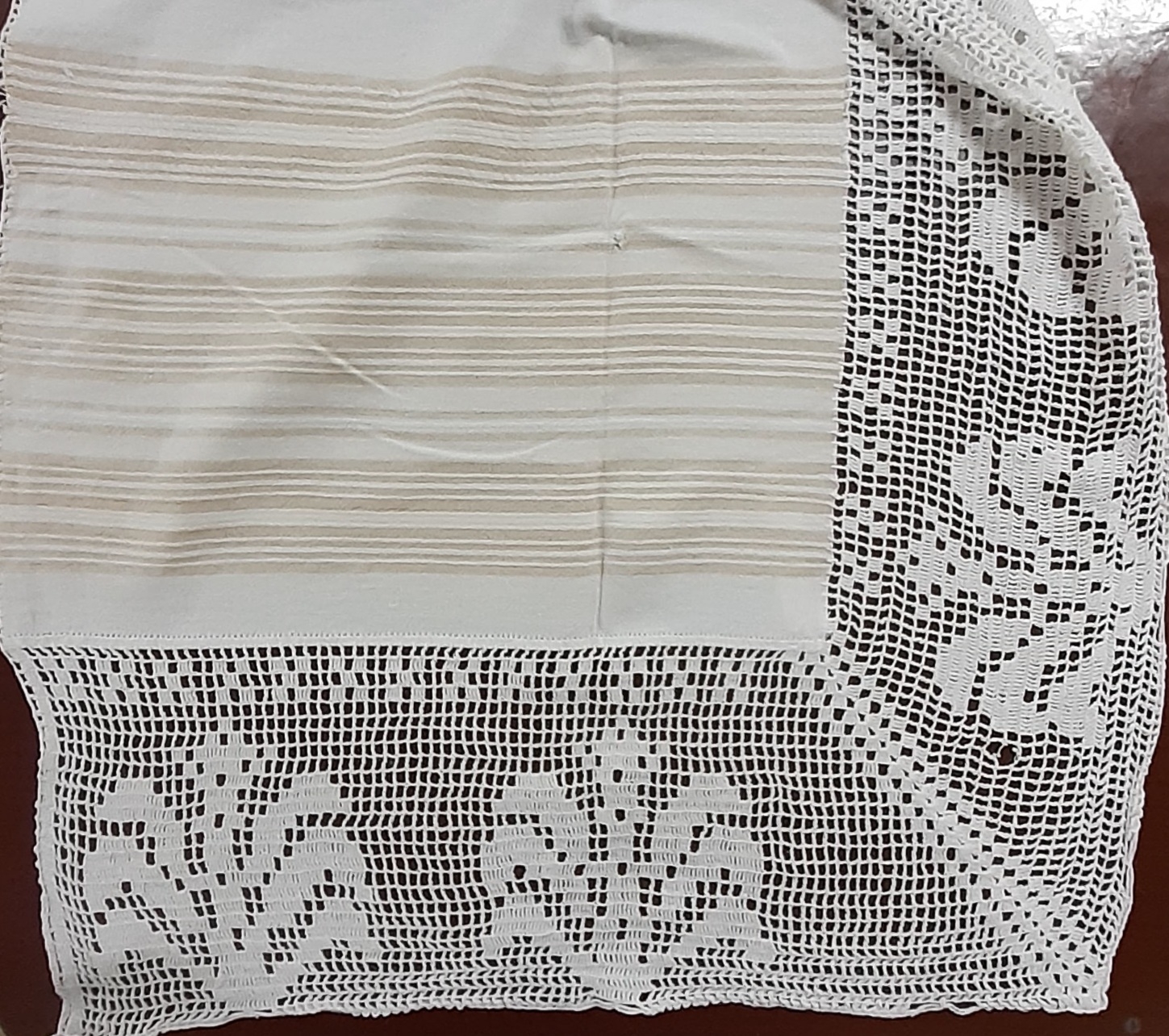 Prosop din bumbac vechi cu podul curat,țesut în două ițe,vrâstat la capete cu vrâste din calacan și tiriplic:trei mari și două mici,croșetat cu dantelă în tehnica filet cu același motiv vegetal la capete și coastă.