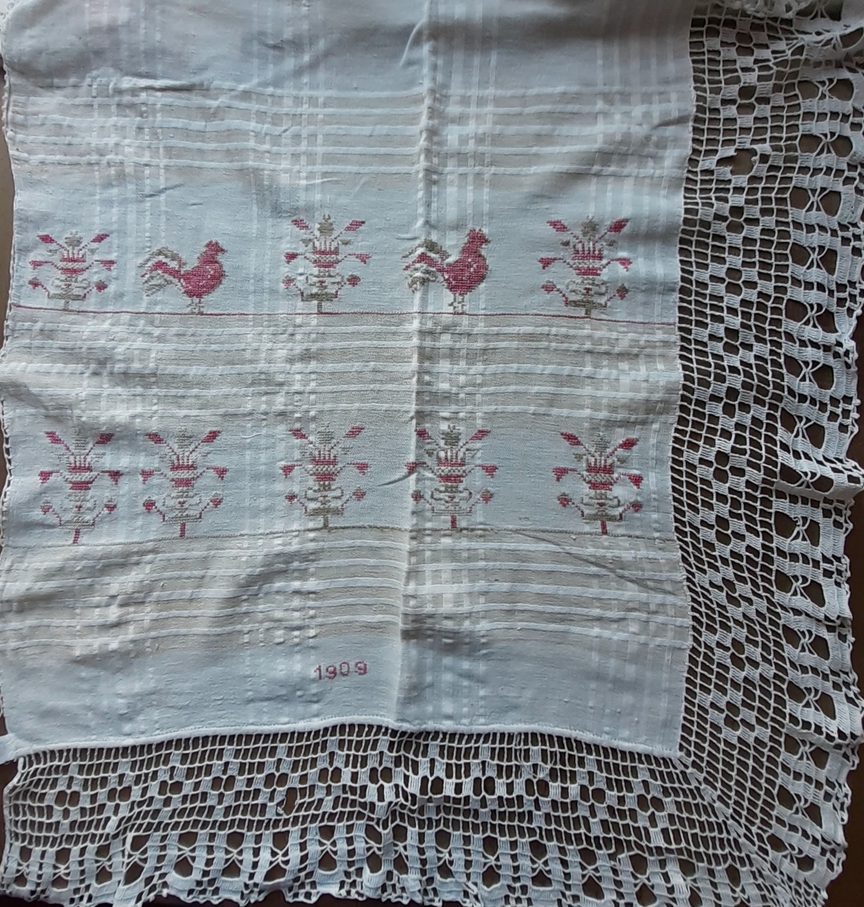Prosop țesut în cadrel cu același registru vertical și orizontal,vrâstat la capete câte trei grupuri de vrâste de calacan și tiriplic;brodat în tehnica cruciuliță obligă;motive:2 rânduri de mo-tive florale-pomul vieții,un rând are și motive zoomorfe-2 cucoși,inscripție brodată-1909; cromatica-roșu,sur;croșetat cu dantelă în tehnica filet cu alelași motiv geometric la capete și coastă.