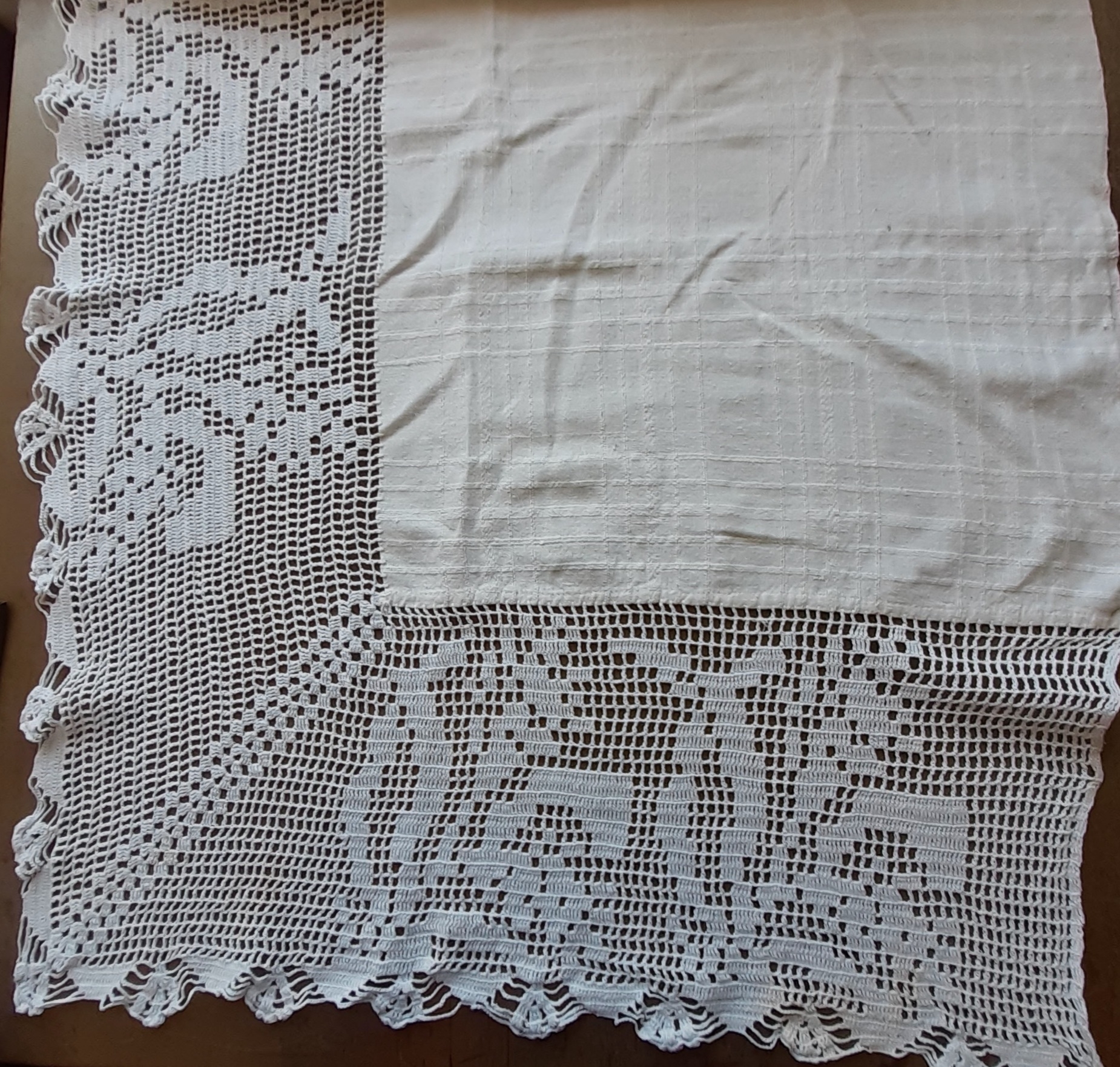 Prosop de bumbac țesut în cadril cu același registru vertical și orizontal, fără margini evidențiate,croșetat la capete și o coastă cu dantelă în tehnica filet,cu același motiv-plasă de pătrățele libere,motiv fitomorf. Marginea este decorată cu un registru deosebit:triunghiuri ,butoane de flori,cinci rânduri de hașură.