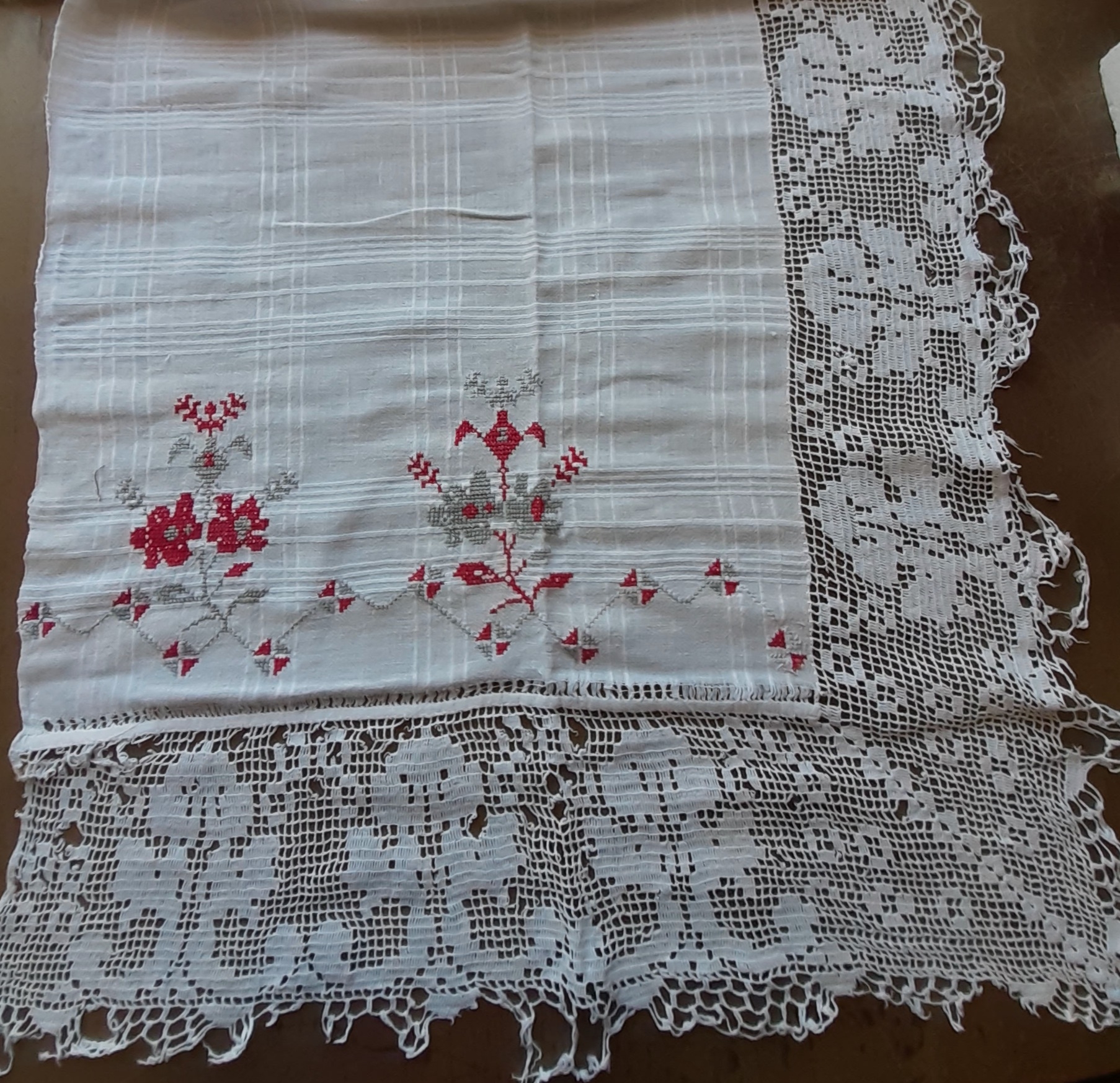 Prosop din bumbac vechi țesut în cadril cu registru vertical,vrâstat la capete orizontal cu tiriplic,brodat în tehnica cruciuliță oblică cu motive florale;cromatica-roșu, sur;croșetat la capete și o coastă cu dantelă în tehnica filet cu aceleași motive fitomorfe.