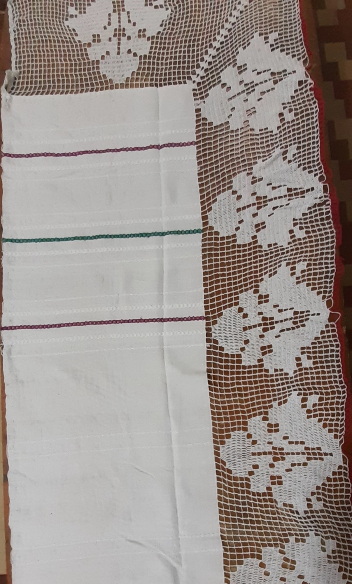 Prosop din bumbac,țesut în 2 ițe,vrâstat la capete cu câte 3 grupuri de vrâste de tiriplic și ață colorată;cromatica-alb,roșu,verde;croșetat la capete și coastă cu dantelă în tehnica filet cu același motiv-plasă, motiv fitomorf vechi,un rând roșu la margină.