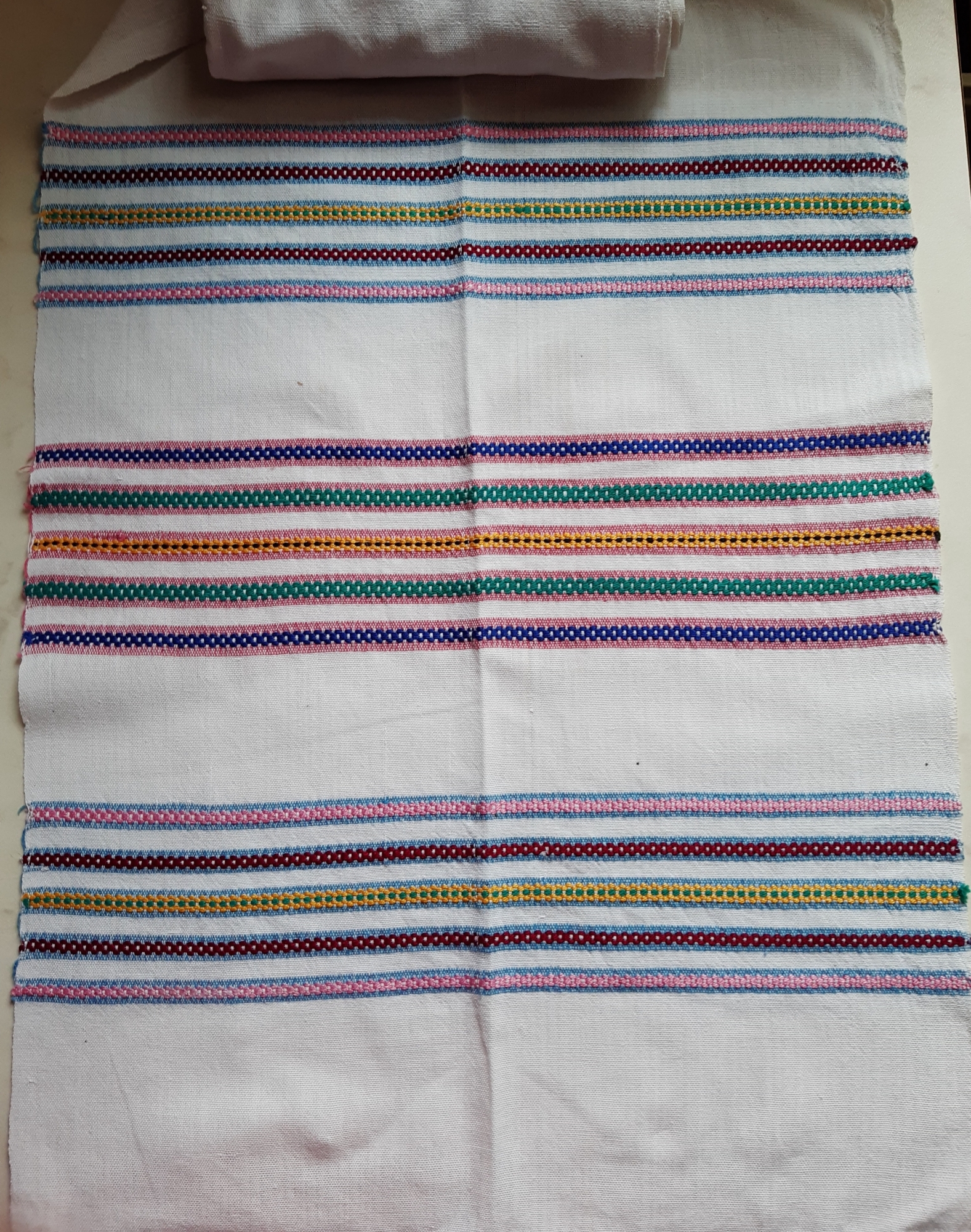 Prosop din bumbac cu podul curat vrâstat la capete cu câte 3 grupuri de vrâste multicolore alese; cromatica: roșu,roz,verde, albastru,galbene.