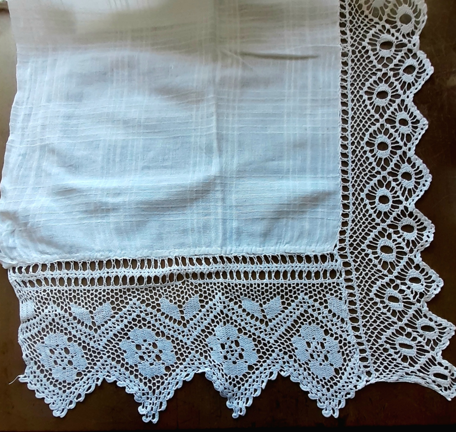 Prosop de bumbac,țesut în cadril cu același registru vertical și orizontal,fără margini evidențiate,croșetat cu dantelă în colțuri la capete și o coastă în tehnica filet cu motive diferite:la capete-bordura:două rânduri de stâlpișori consecutivi, uniţi la mijloc câte doi, formând gardul legat sau crucea,între ei rând de patrate pline și libere, plasă din pătrățele libere, două zigzacuri ,între ele motiv fitomorf,câte 2 frunze,motiv floral-trandafir,la capete-2 zigzacuri,capătul de jos-colțuri, Marginea colţului este festonată printr-un rând de elemente ce amintesc evantaiul;coasta-rând de stâlpișori ,uniți la mijloc câte doi,formând gardul legat sau crucea,plasă din pătrățele libere,două rânduri de motivul ochiului,la capete un rând de zigzag.