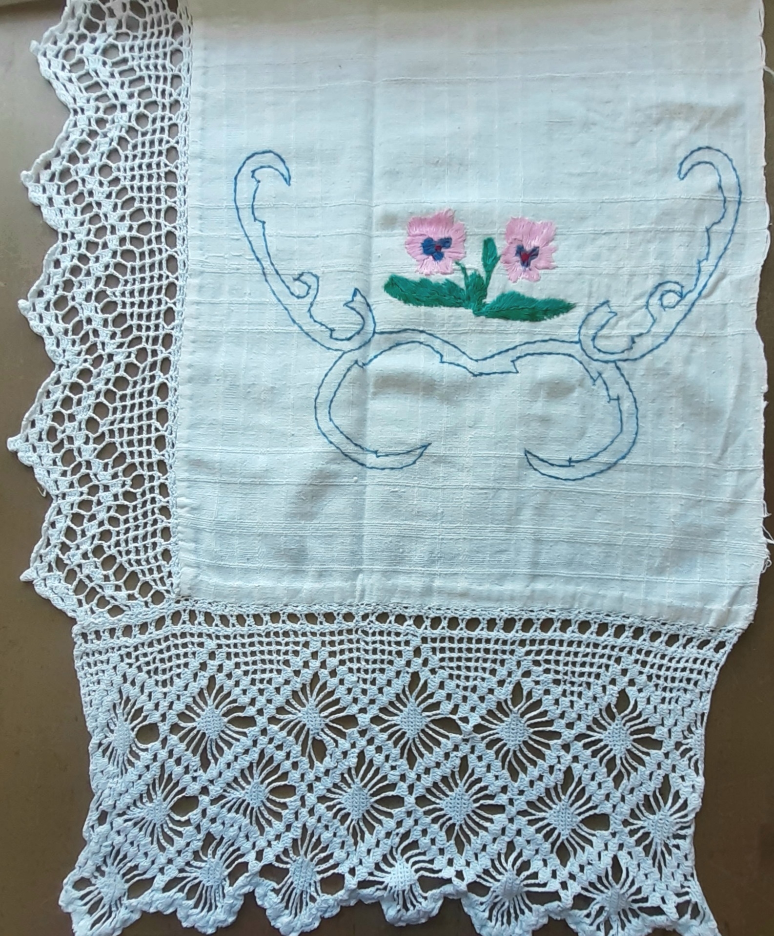 Prosop țesut în cadrel,fără margini evidențiate,brodat în tehnicile suprafață plană, pas înapoi cu motiv floral la capete; cromatica:roz,verde,albastru,roșu;croșetat la capete și la o coastă cu dantelă în colțuri în tehnica filet cu motive diferite:la capete-bordura:un rând de stâlpișori consecutivi, uniţi la mijloc câte doi, formând gardul legat sau crucea, plasă din patrate libere,3 rânduri de romburi-motivul soarelui,la coastă-bordura:un rând de stâlpișori consecutivi, uniţi la mijloc câte doi, formând gardul legat sau crucea ,plasă de patrate libere,două rânduri de zigzag(câte un rând-patrate libere,un rând-patrate pline) Marginea colţului este festonată printr-un rând de elemente ce amintesc evantaiul.