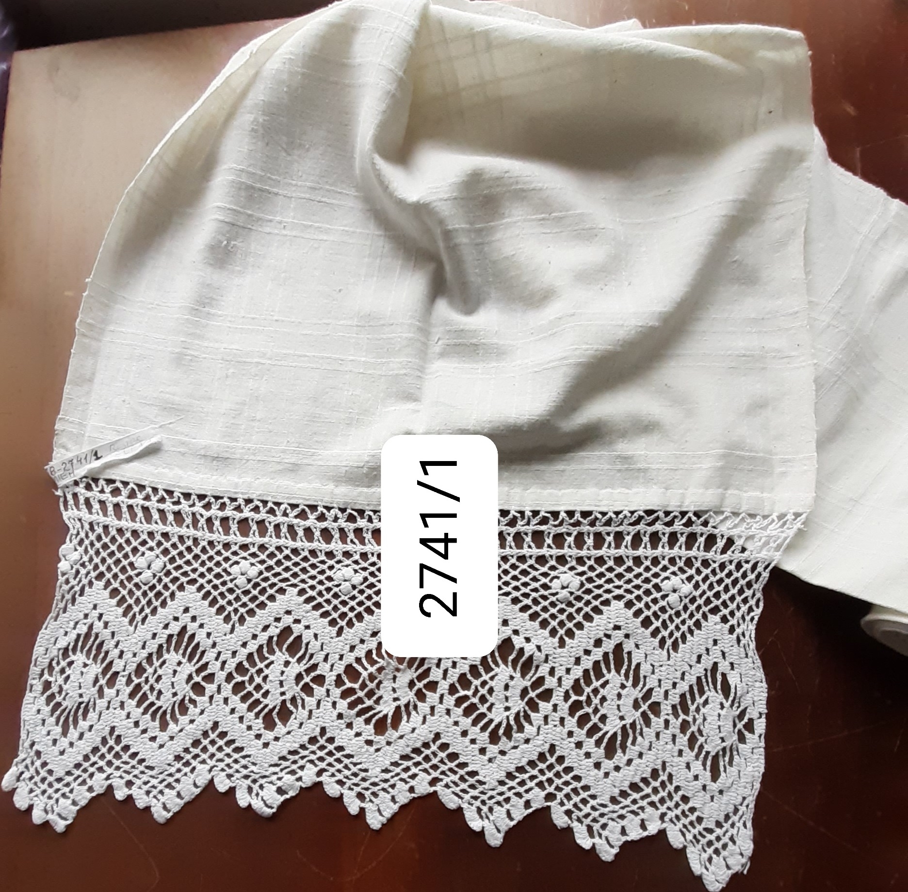 Prosop de bumbac,țesut în cadrel,fără margini evidențiate,croșetat la capete cu dantelă în colțuri în tehnica mușchi;motiv-plasă,2 registre:motiv floral,geometric.