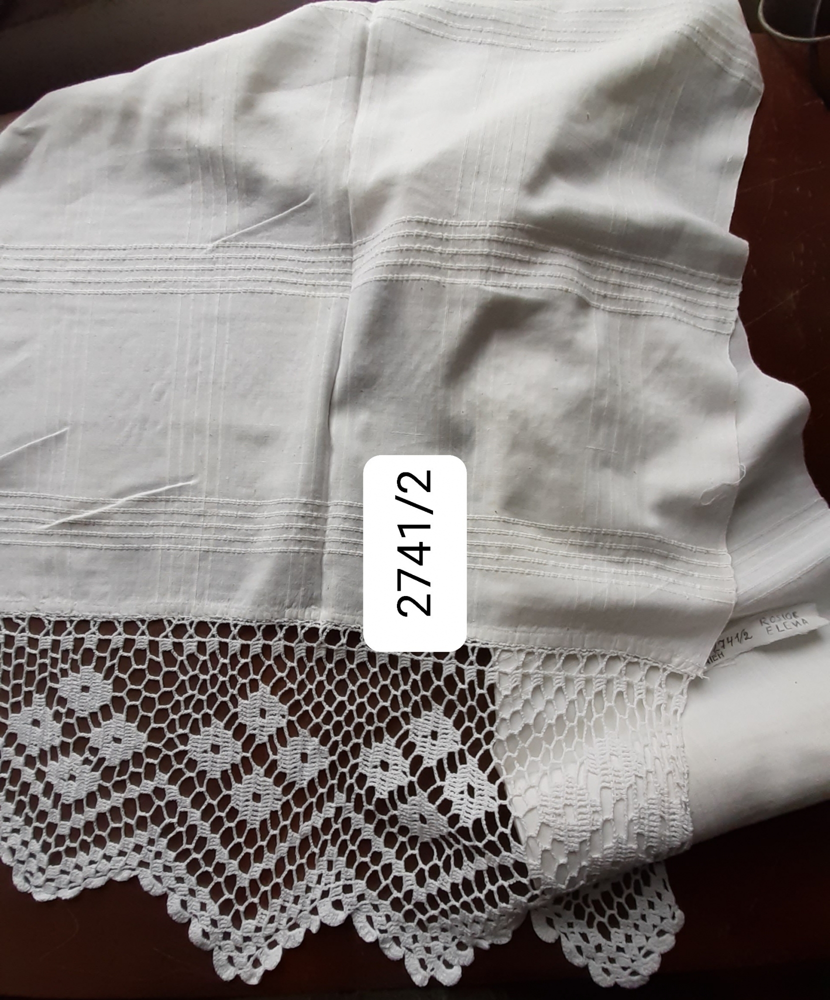 Prosop de bumbac țesut în cadrel fără margini evidențiate,croșetat la capete cu dantelă lată în colțuri,motiv-registru floral,lungimea croșetei-21 cm.