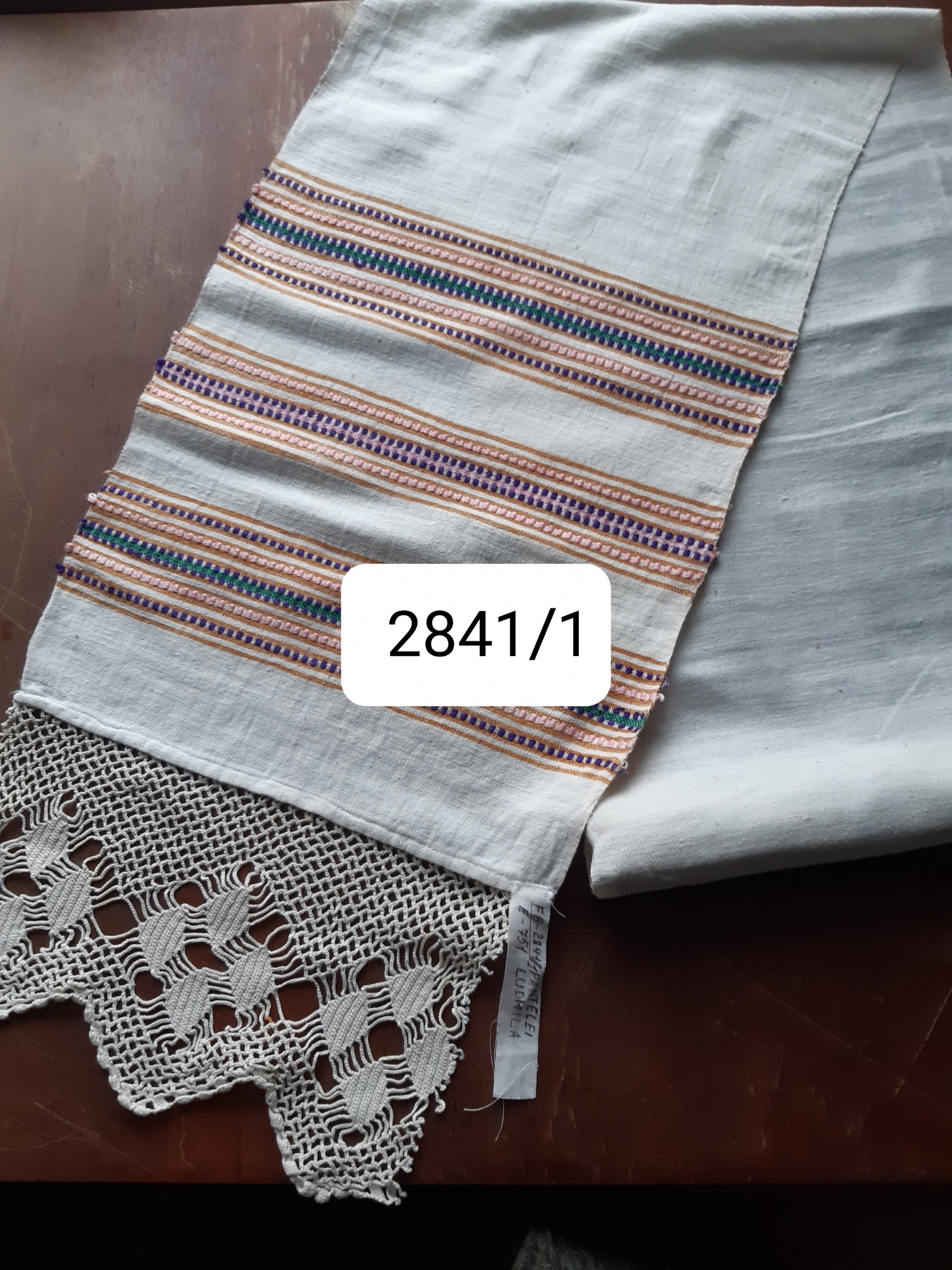 Prosop de bumbac,țesut în două ițe,podul curat,vrâstat cu vrâste colorate la capete(câte 3 vrâste la margini;culori-roz,verde, violet), croșetat la capete cu dantelă în colțuri, motiv-plasă,registru geometric.