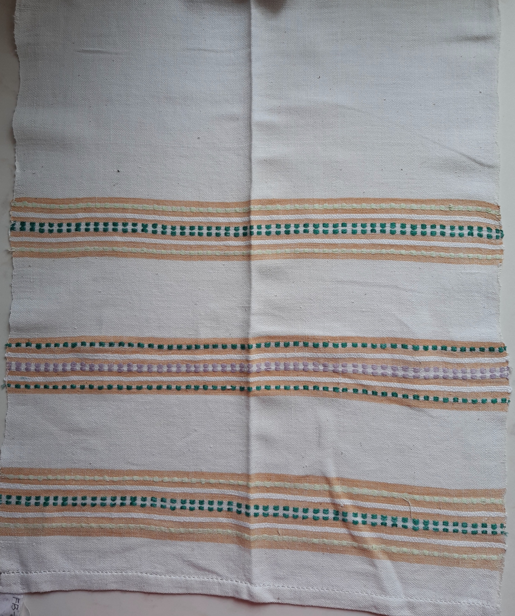 Prosop de bumbac alb și cu câte trei vrâste din bumbac galben la capete,vrâste de tiriplic verde,violet.