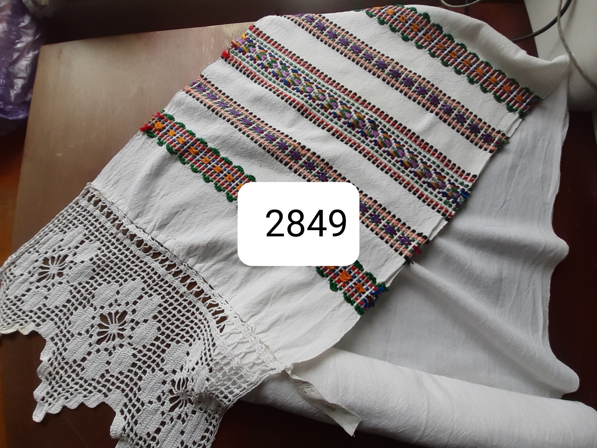 Prosop țesut cu podul curat,vrâstat cu câte 5 vrâste colorate(în mijloc-una mai lată) la capete. Cromatica:verde,roșu,negru,violet,albastru,maro,portocaliu;croșetat cu dantelă în colțuri în tehnica filet,motiv- plasă,registru floral-3flori stilizate.