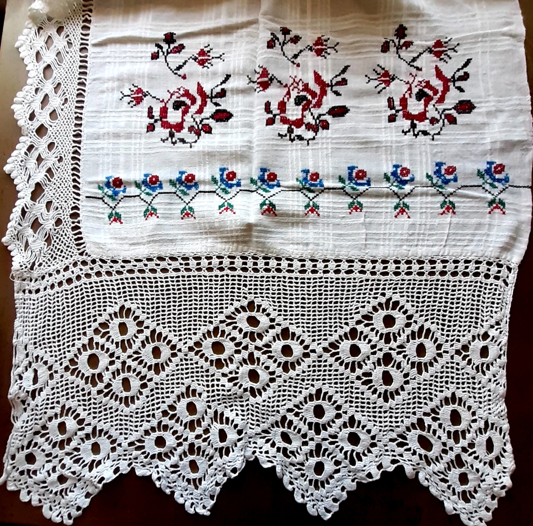 Prosop de bumbac țesut în cadril cu același registru vertical și orizontal,fără margini evidențiate,brodat la capete în tehnica cruciuliță obligă,motiv floral;cromatica:roșu,negru, verde,albastru;croșetat la capete și o coastă cu dantelă în colțuri în tehnica filet;motive diferite.La capete- bordura:două rânduri de stâlpișori consecutivi, uniţi la mijloc câte doi, formând gardul legat sau crucea,între ei un rând de patrate pline și libere,plasă de patrate libere, două rânduri de romburi(cu câte 4 motive-ochiul) dispuse între o plasă de patrate libere, la capătul de jos-colțuri.Marginea colţului este festonată printr-un rând de elemente din trei pătrățele pline ce amintesc evantaiul.La o coastă-bordura rând de picioare,plasă în zigzag, romburi mari cu câte 4 motive ale soarelui,la capătul de jos-colțuri.Marginea colţului este festonată printr-un rând de elemente din două pătrățele pline ce amintesc evantaiul.