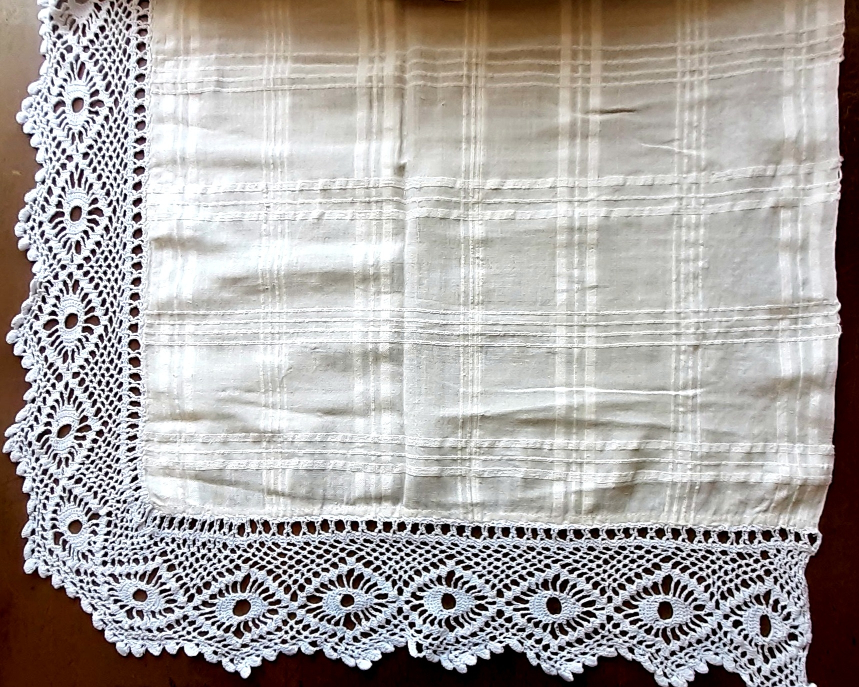 Prosop din bumbac fin, țesut în cadril cu același registru vertical și orizontal,fără margini evidențiate,croșetat la capete și o coastă cu dantelă în colțuri în tehnica filet cu același motiv geometric.Motiv-bordura:rând de stâlpișori consecutivi,plasă, Un rând,la mijloc alcătuit din romburi-motivul ochiului. Capătul de jos se compune din colţuri la distanțe egale.Marginea colţului este decorată printr-un rând de elemente ce amintesc evantaiul.