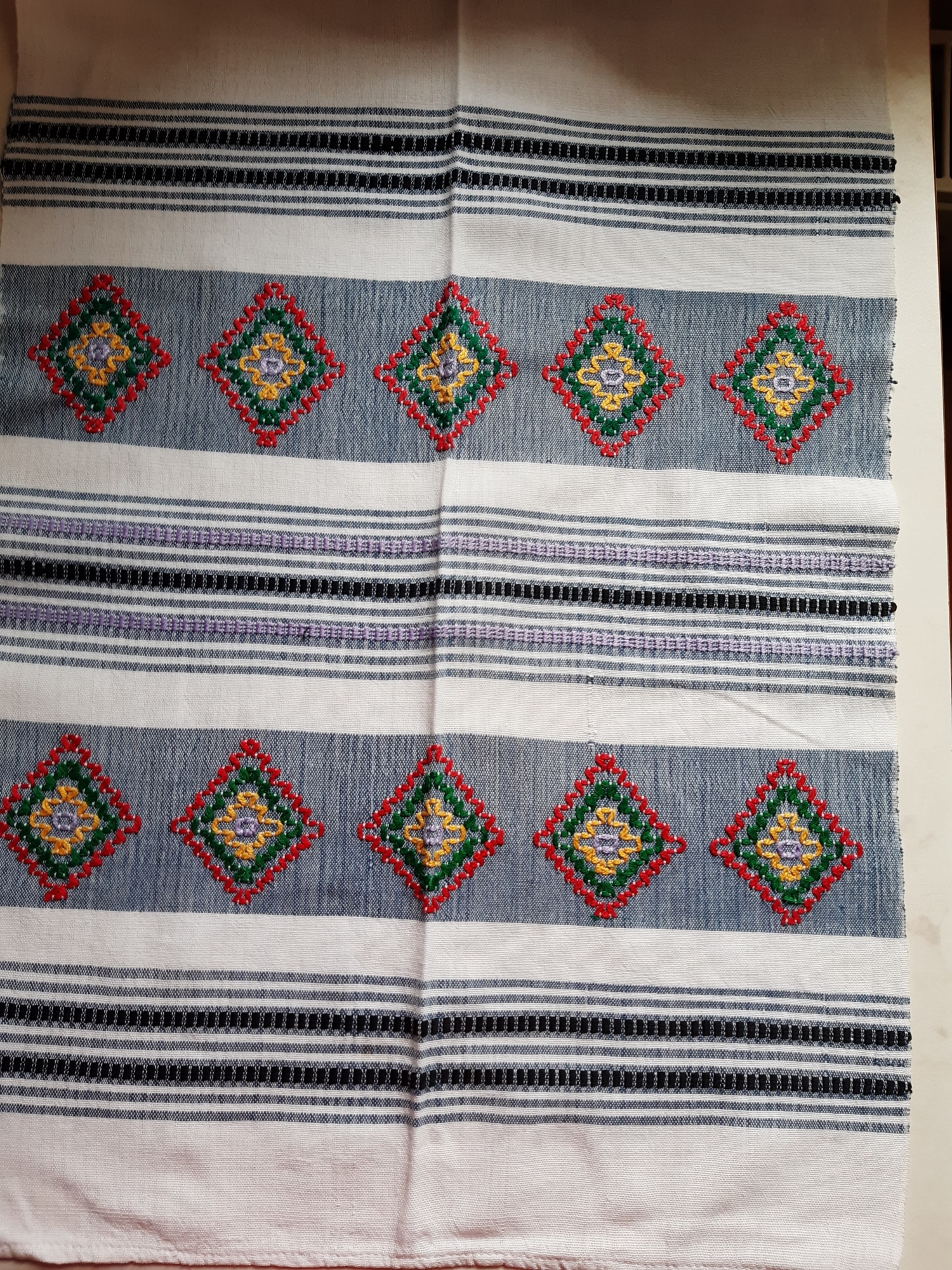 Prosop de bumbac cu podul curat, vrâstat la capete cu câte 3 grupuri de vrâste (albastre,negre,albe) și 2 vrâste țesute cu bumbac albastru și motive geometrice alese-5 romburi;cromatica:roșu,verde,galben, violet.
