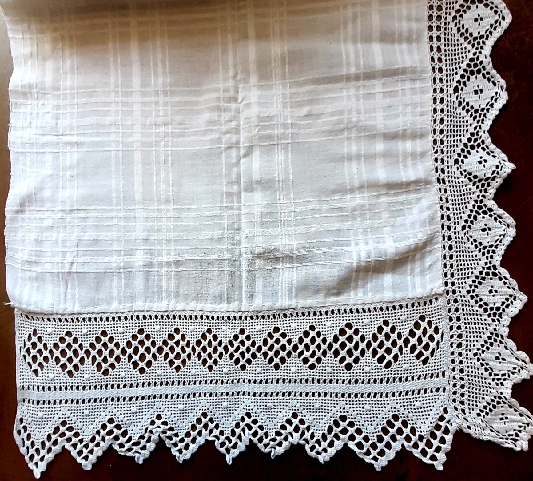 Prosop de bumbac țesut în cadril fără margini evdențiate,croșetat la capete și o coastă cu dantelă în colțuri în tehnica filet cu motive geometrice diferite.La capete-bordura:un rând de stâlpișori consecutivi, uniţi la mijloc câte doi, formând gardul legat sau crucea,plasă de patrate libere,buline,un rând de romburi din plasă compusă la mijloc,un rând de stâlpișori consecutivi, uniţi la mijloc câte doi, formând gardul legat sau crucea,dantelă din 5 stâlpișori cu jeteu, un rând de stâlpișori consecutivi, uniţi la mijloc câte doi, formând gardul legat sau crucea,plasă,buline,zigzag de patrate pline, zigzag de plasă compusă.Capătul de jos se compune din colţuri la distanțe egale. Marginea colţului este decorată printr-un rând de patrate pline.