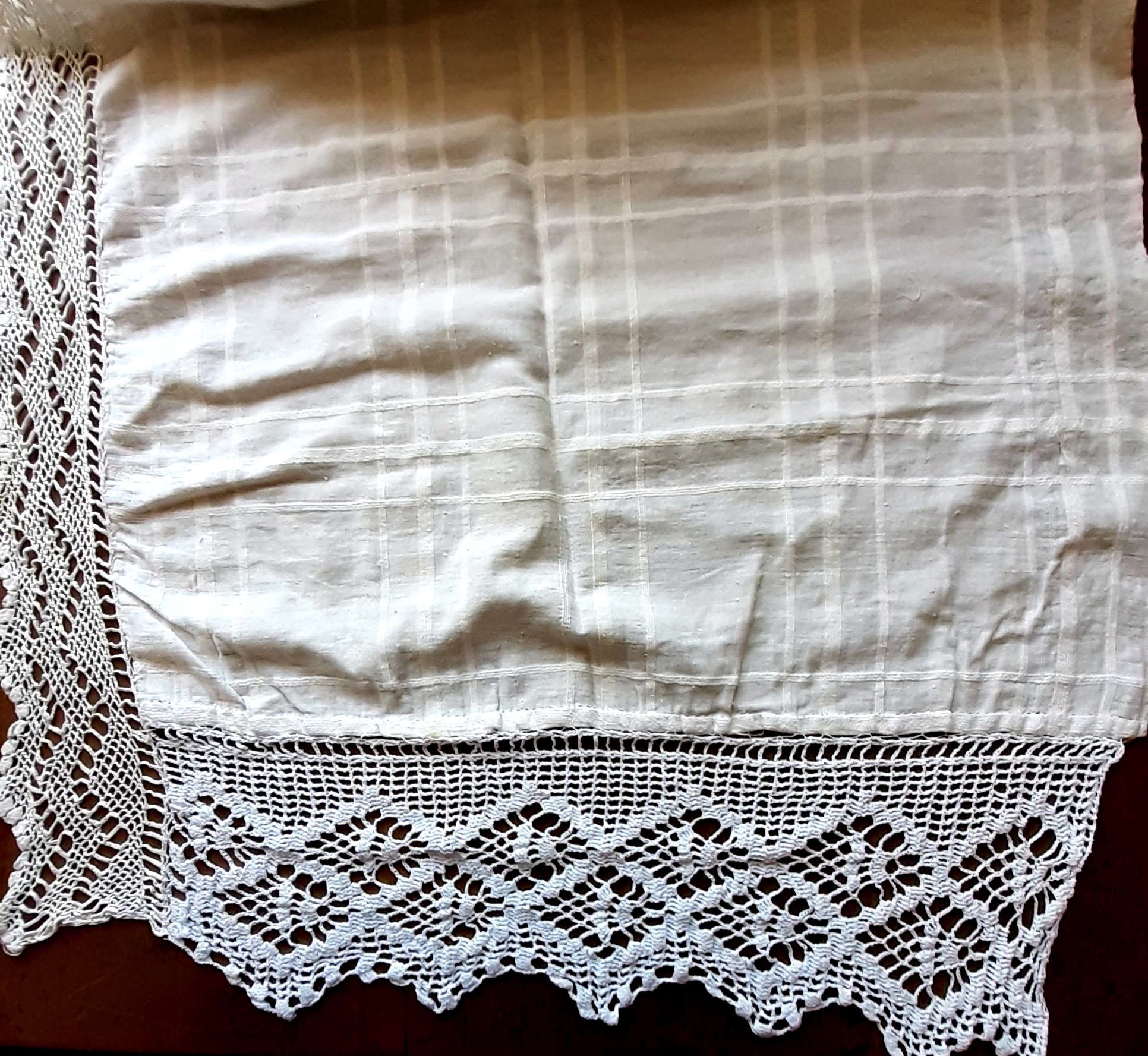 Prosop țesut în cadril fără margini evidențiate croșetat cu dantelă în colțuri în tehnica filet cu motive geometrice diferite.La capete- bordura:rând de stâlpișori consecutivi, plasă din patrate libere,două rânduri de romburi la mijloc. Capătul de jos se compune din colţuri la distanțe egale.Marginea colţului este decorată printr-un rând de elemente ce amintesc evantaiul.La coastă-rând de piciorușe lungi,plasă din patrate libere așezate în colț,două rânduri de zigzaguri din picioare lungi. Capătul de jos se compune din colţuri la distanțe egale.Marginea colţului este decorată printr-un rând de elemente ce amintesc evantaiul.