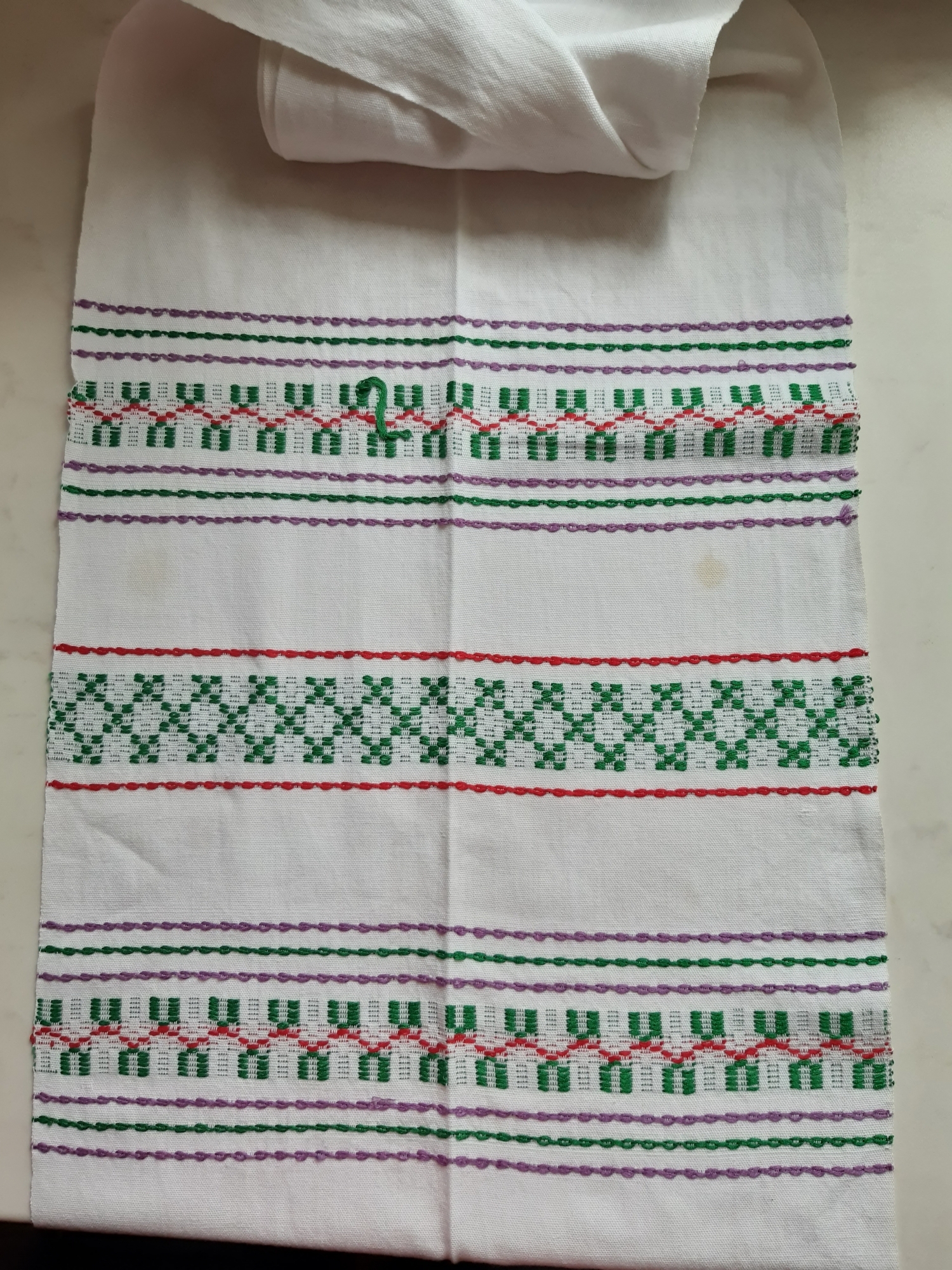 Prosop de bumbac țesut în două ițe,fabricat în atelier urban,cu podul curat, la capete cu câte 3 grupe de vrâste, țesute în mai multe ițe ornamental alese cu fire colorate;motive:geometrice-romb,lănțișor,zig-zag,unghiuri;cromatica:verde,violet, roșu.