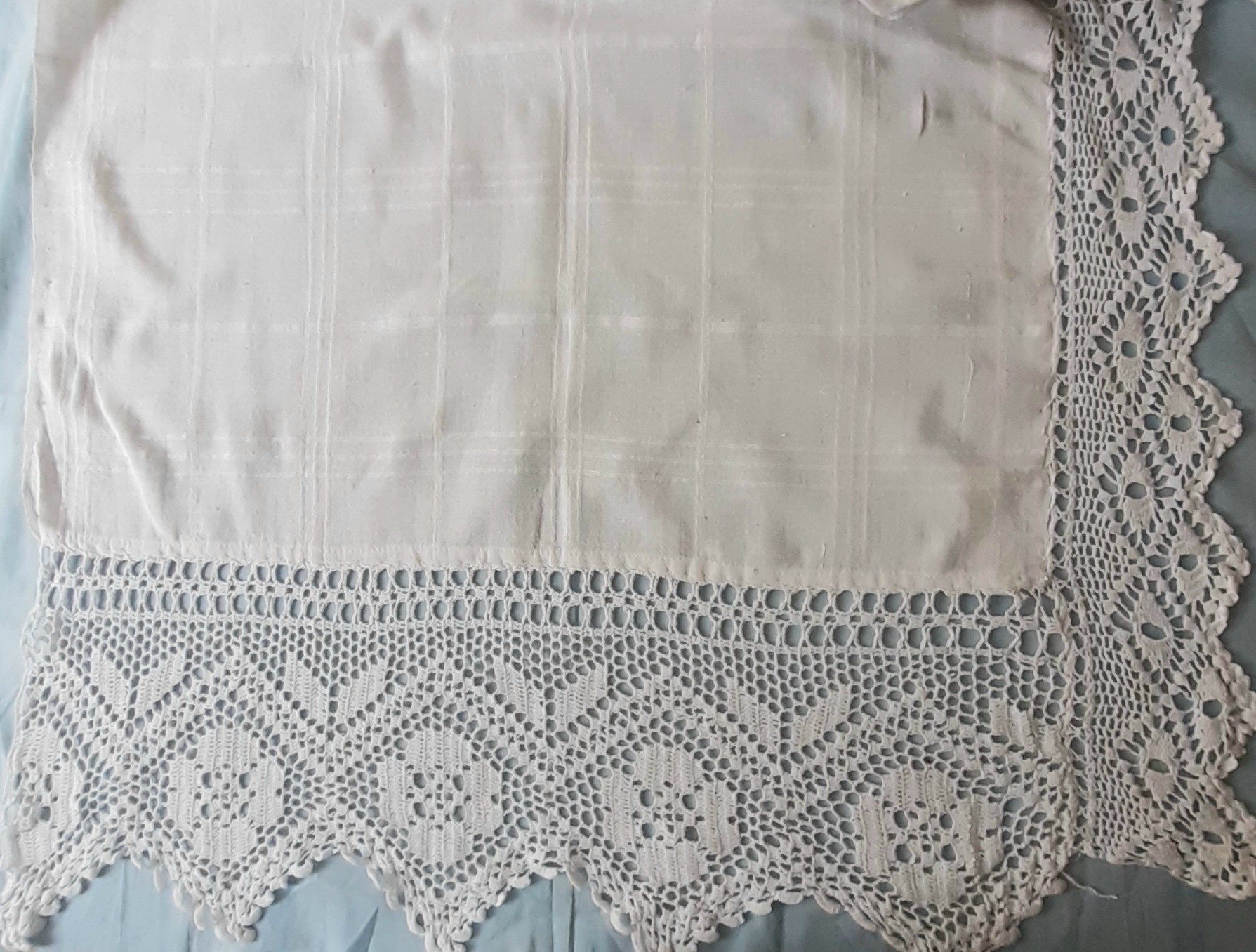 Prosop de bumbac țesut în cadrel,fără margini evidențiate, croșetat la capete și o coastă cu dan-telă în colțuri în tehnica filet cu motive diferite.La capete-bordura:două rânduri de stâlpișori consecutivi, uniţi la mijloc câte doi, formând gardul legat sau crucea,între ei rând de patrate pline și libere, plasă din pătrățele libere, două zigzaguri ,între ele motiv fitomorf,câte 2 frunze,motiv floral-trandafir; Capătul de jos se compune din colţuri. Marginea colţului este festonată printr-un rând de elemente ce amintesc evantaiul.La coastă-bordura:un rând de stâlpișori ce formează gardul legat sau crucea,plasă,două rânduri de romburi cu motivul ochiului,capătul de jos-colțuri,marginea-un rând de patrate pline.