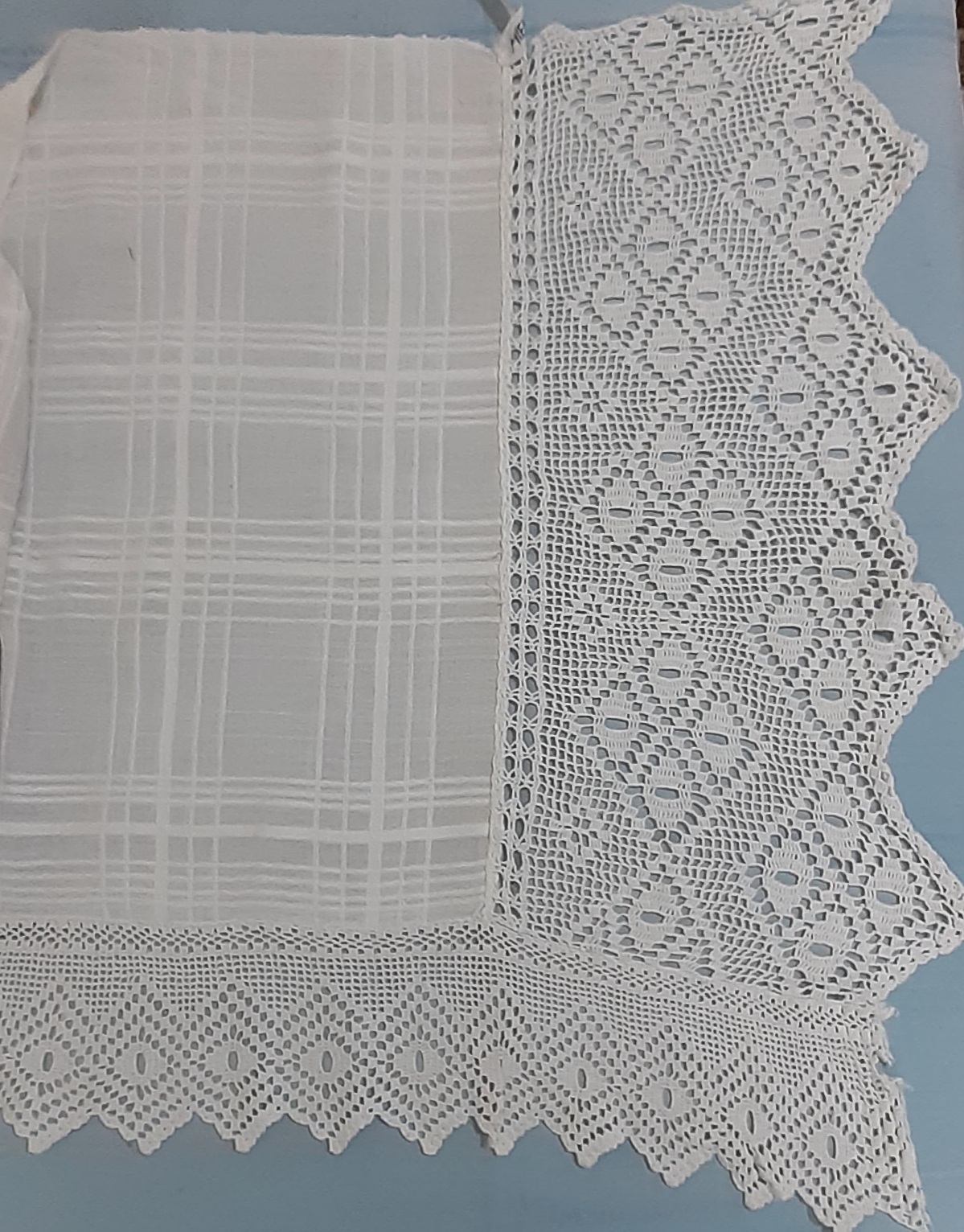Prosop de bumbac,țesut în cadril cu registre verticale și orizontale diferite,fără mar-gini evidențiate;croșetat la capete și o coastă în tehnica filet cu motive diferite.La capete-bordura:două rânduri de stâlpișori consecutivi, uniţi la mijloc câte trei, formând gardul legat sau crucea,plasă,romburi mici,două rânduri de romburi mari(formate din 4 romburi mici-motivul ochiului) între ele dispusă plasă de patrate libere.Capătul de jos se compune din colţuri, care se repetă ritmic la distanţe egale. Marginea colţului este decorată cu pătrăţele pline,goale. Coasta-bordura:panglică croșetată din 4 rânduri de pătrățele pline,goale pe margini și două rânduri de pătrățele goale în mijloc,plasă, câte 3 rânduri de pătrățele pline în zigzag sus și jos , iar în mijloc motivul ochiului.Capătul de jos se compune din colţuri.Marginea colţului este decorată cu pătrăţele pline.