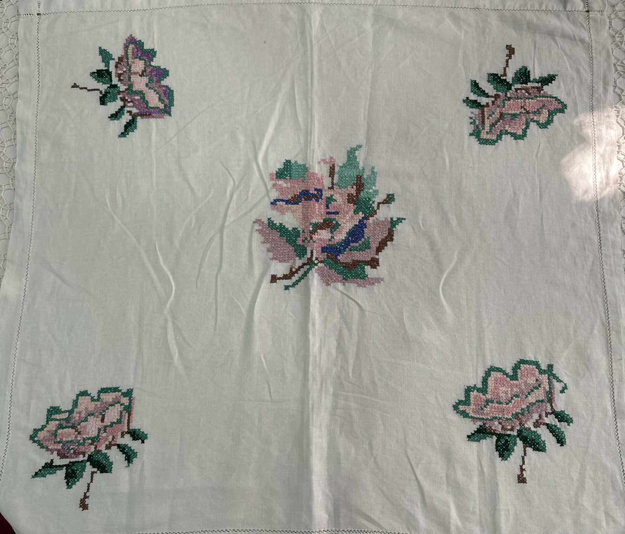 Țesătură de formă dreptunghiulară, confecționată din pânză albă, ornamentată cu motive florale mari (trandafiri), stilizate, realizate prin broderie în cruciuliță cu fir colorat din bumbac. Compoziția decorativă este dispusă simetric: un buchet floral central și patru flori plasate în colțuri. Cromatica este dominată de nuanțe pastelate de roz, verde, maro și albastru, armonios combinate. Marginea acoperitorii este finisată prin tivire, manual, conferind obiectului un aspect decorativ simplu. Obiect textil de uz gospodăresc și decorativ, folosit pentru acoperirea pernelor de pat sau a celor expuse în lada de zestre, contribuind la înfrumusețarea interiorului tradițional.