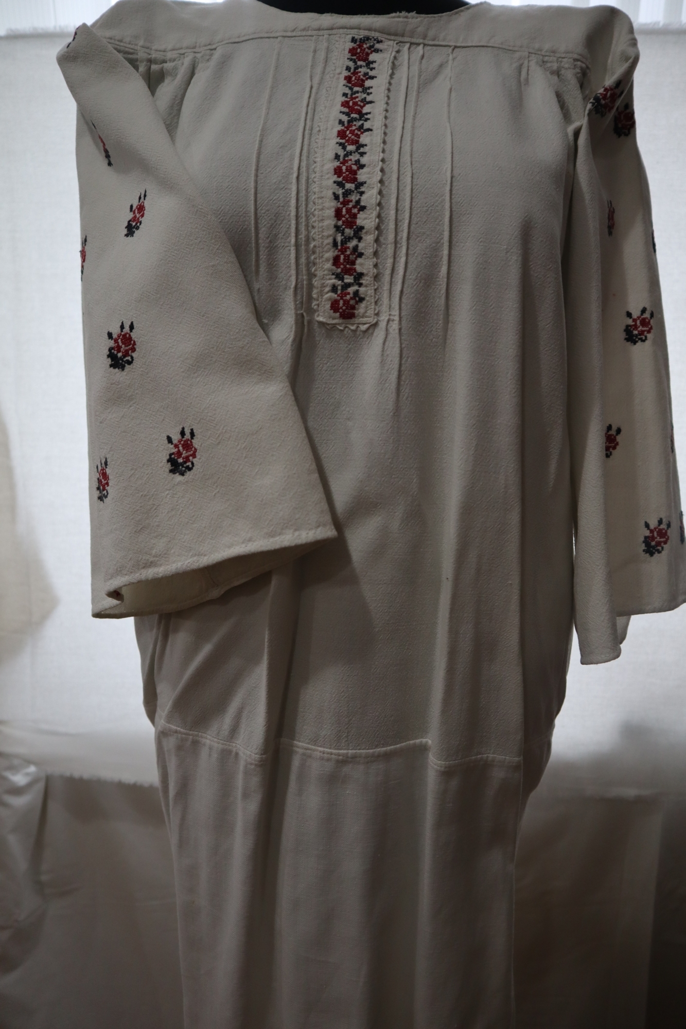 cămașă femeiască cu platcă în față și pavă sub braț. Partea superioară este decorată pe piept cu un registru vertical de broderie florală, cu motive stilizate repetitive. Mânicile sunt largi, decorate cu motive florale mici, dispuse ritmic pe suprafața țesăturii. Poalele sunt adăugate separat. Cromatica: alb, roșu, negru.