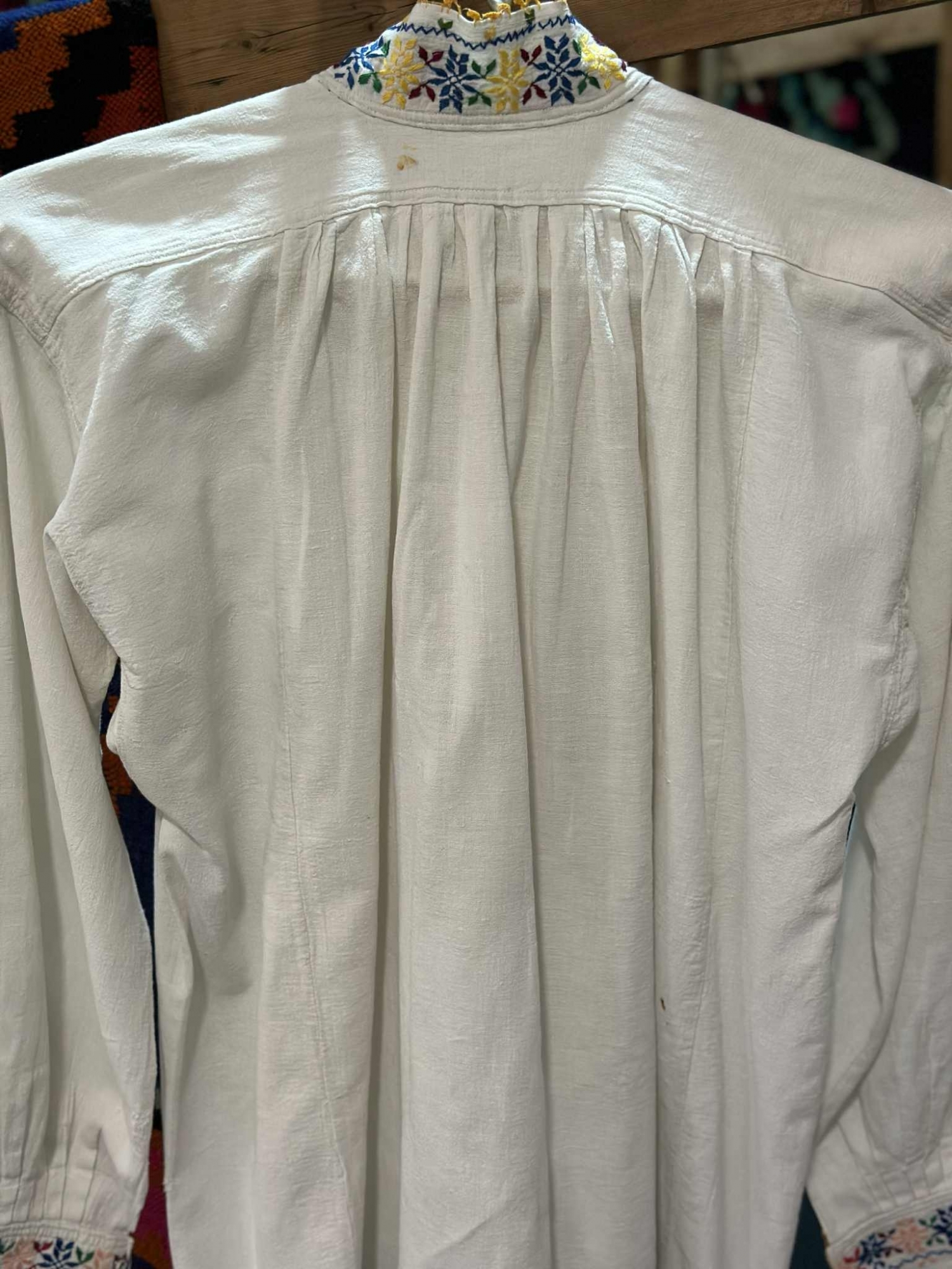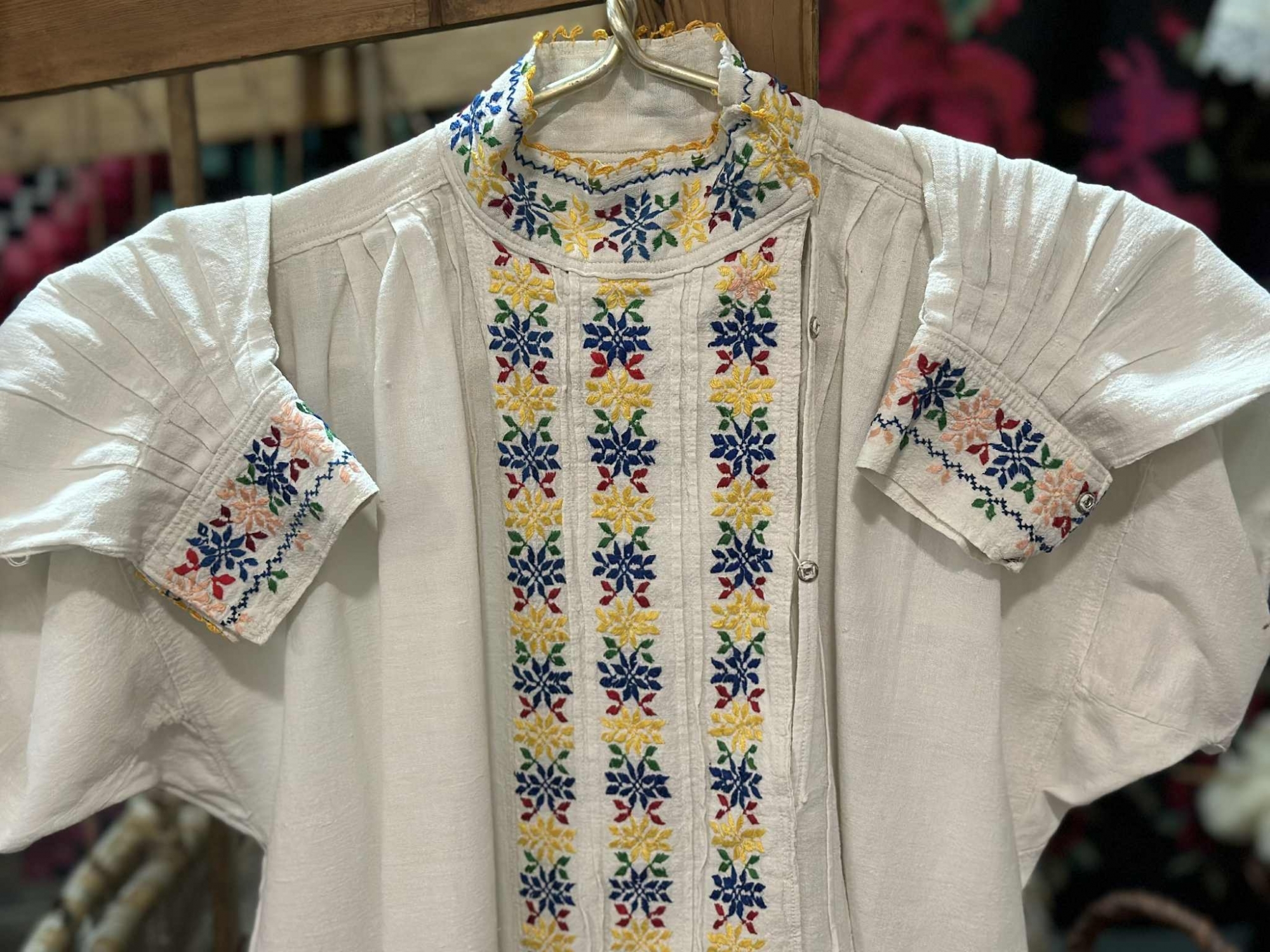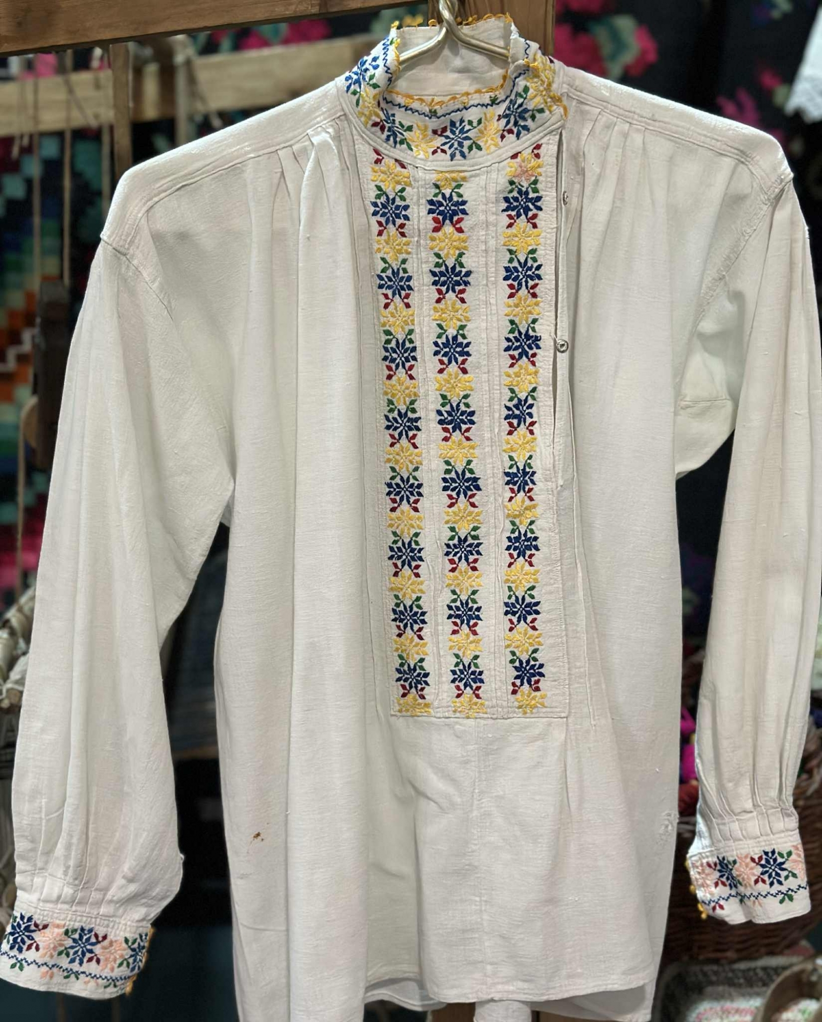 Cămașă tradițională bărbătească confecționată din pânză albă, cu croială largă și mâneci încrețite la umăr. Pieptul este ornamentat cu trei registre verticale de motive geometrico-florale, realizate prin broderie policromă. Gulerul înalt, ușor încrețit, este brodat cu același model floral stilizat în nuanțe vii, terminate cu margine decorativă galbenă. Manșetele late sunt brodate cu motive florale dispuse orizontal, în culorile roșu, albastru, galben și verde. Cămașa se închide frontal cu nasturi mici metalici.