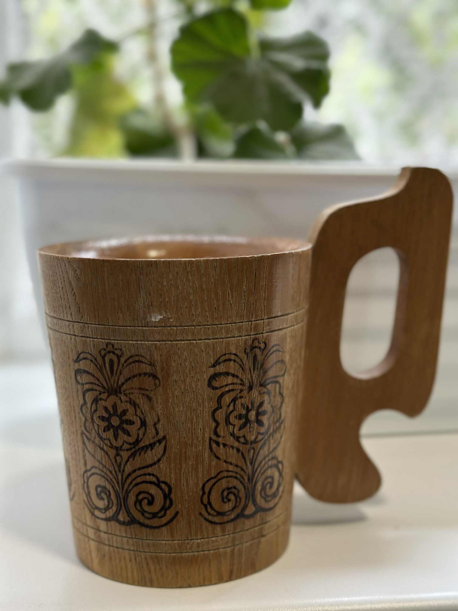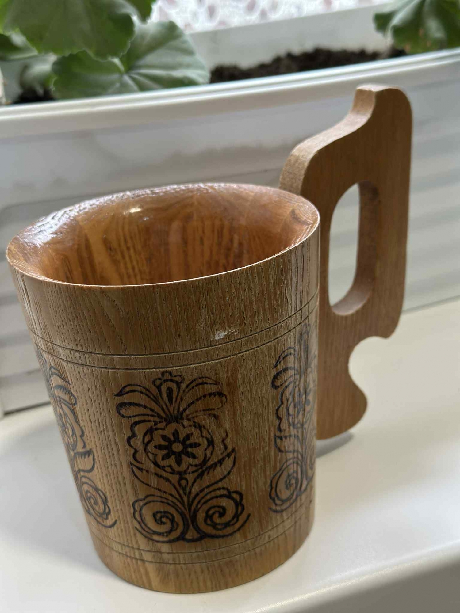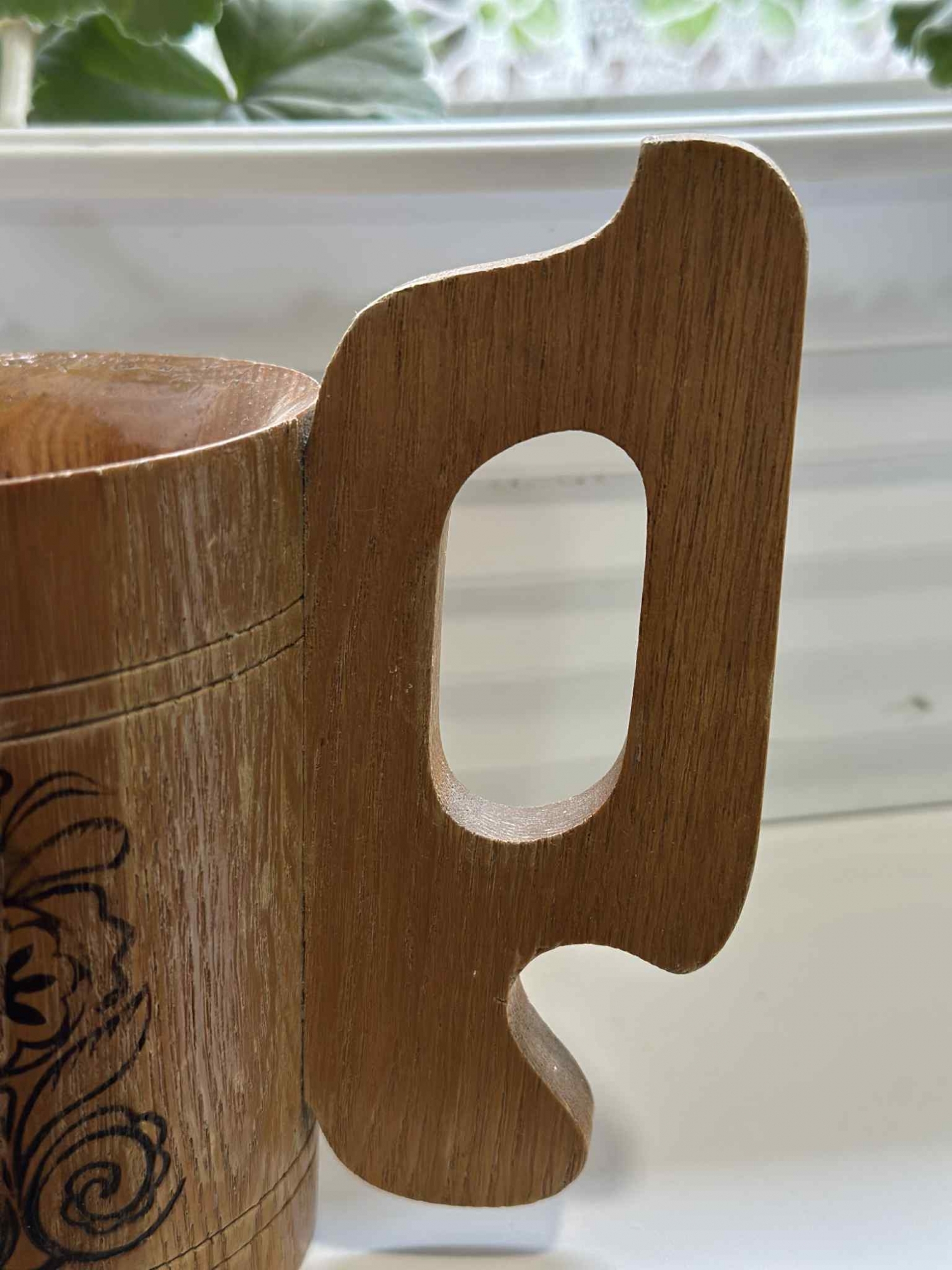 Cană tradițională din lemn, confecționată manual și decorată cu motive populare gravate. Obiectul are formă cilindrică, cu mâner lat și sculptat în stil rustic, specific obiectelor de uz gospodăresc din trecut. Pe suprafața exterioară sunt realizate ornamente florale simetrice, stilizate, reprezentând flori și frunze, motive frecvent întîlnite în arta populară. Lemnul este lăcuit, oferind o nuanță caldă și protejînd suprafața de uzură. Este un obiect cu valoare decorativă și etnografică, reprezentând meșteșugul și tradițiile populare.