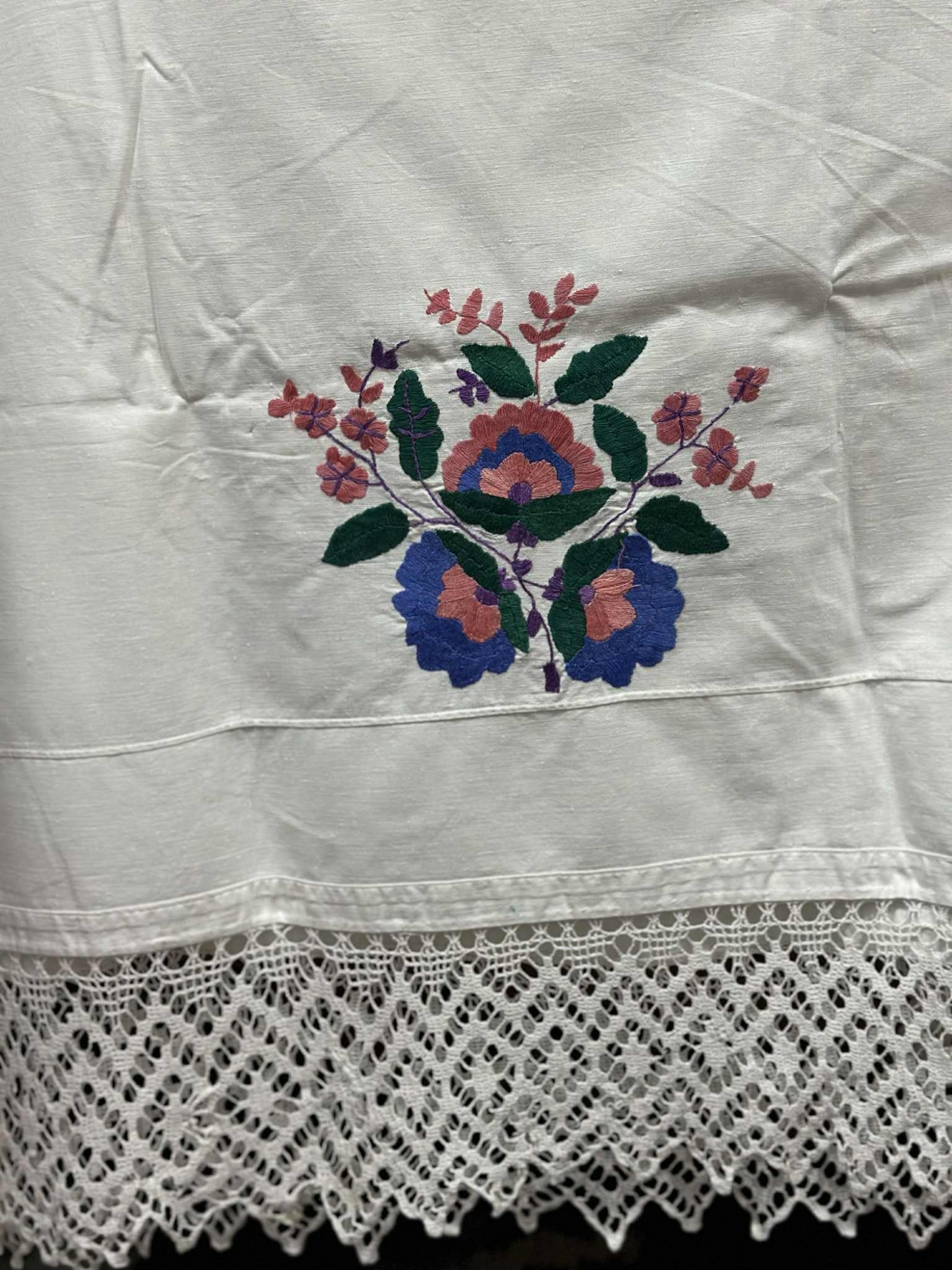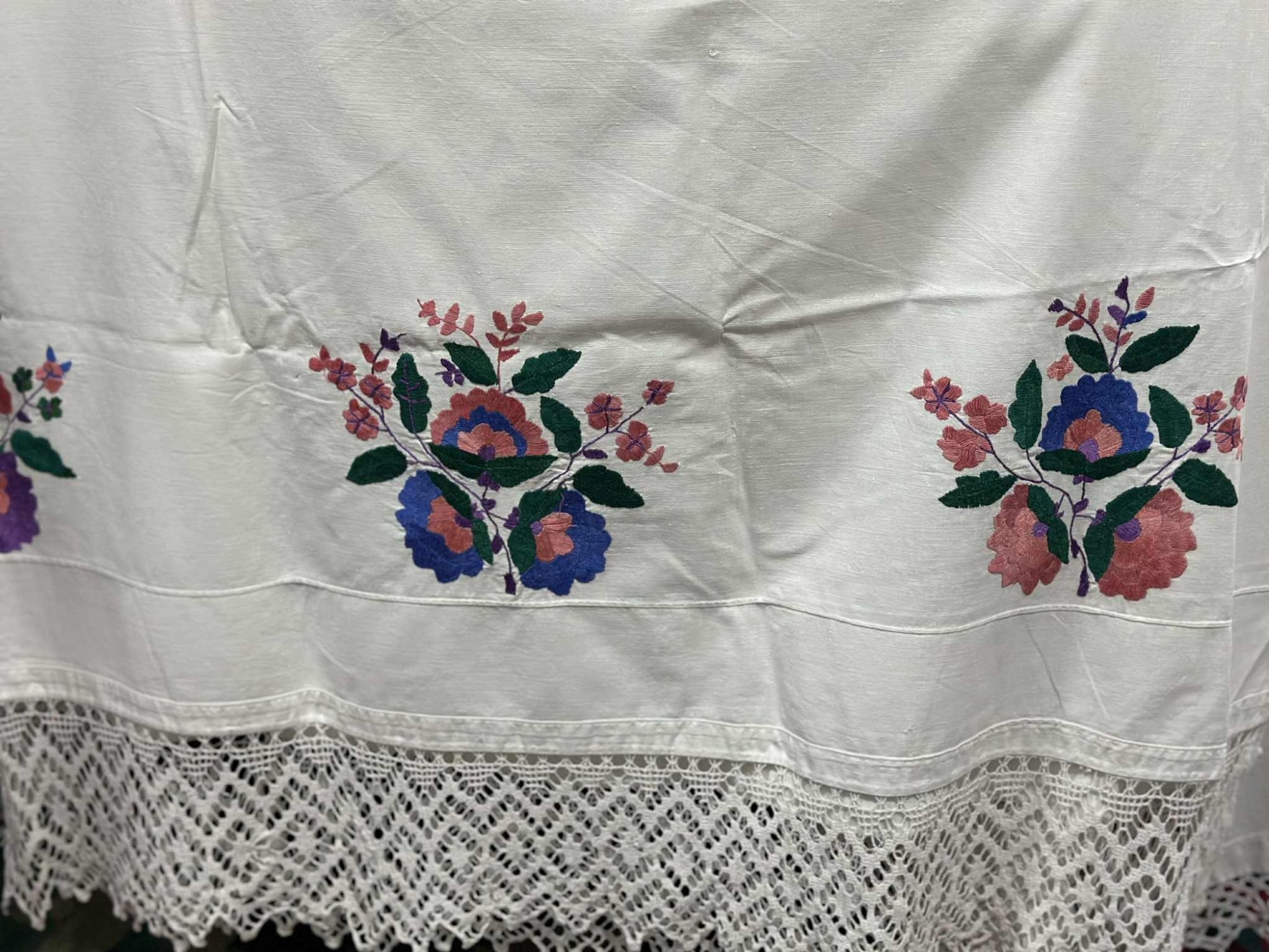 Cearceaf din pânză albă de bumbac, decorat în partea inferioară cu compoziții florale mari, brodate manual. Motivele sunt dispuse simetric și reprezintă buchete stilizate cu flori mari în nuanțe de roz, mov, albastru și verde. Broderia este realizată cu fir colorat, în puncte pline și contur, conferind un aspect bogat și echilibrat piesei. Marginea de jos este terminată cu o dantelă lată, croșetată manual, cu model geometric în rețea de romburi.