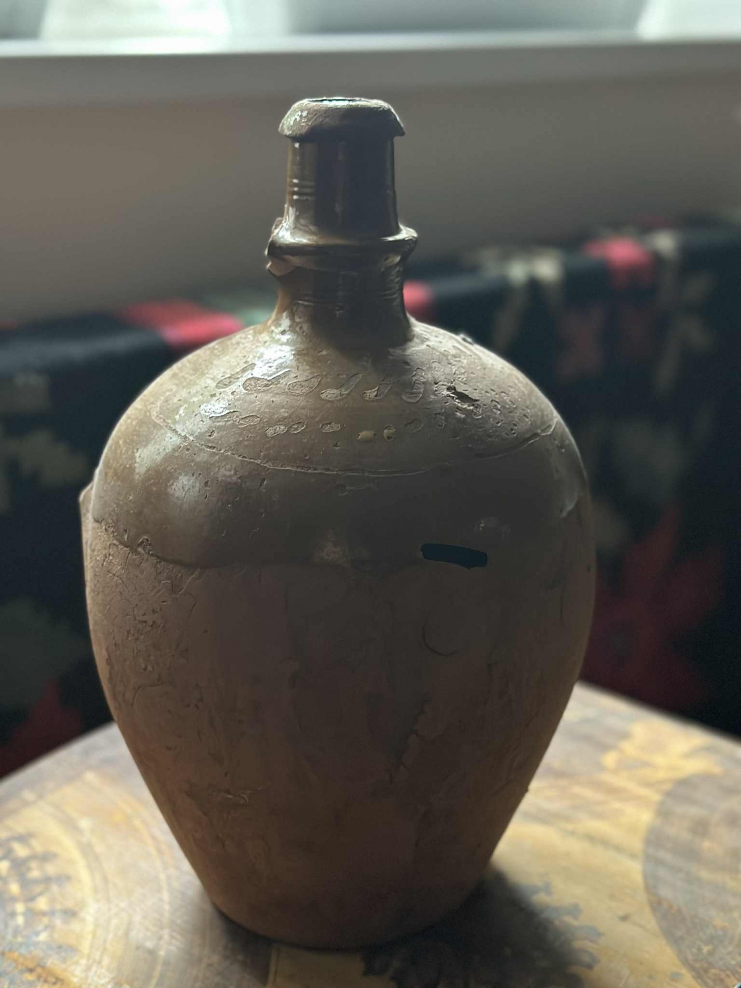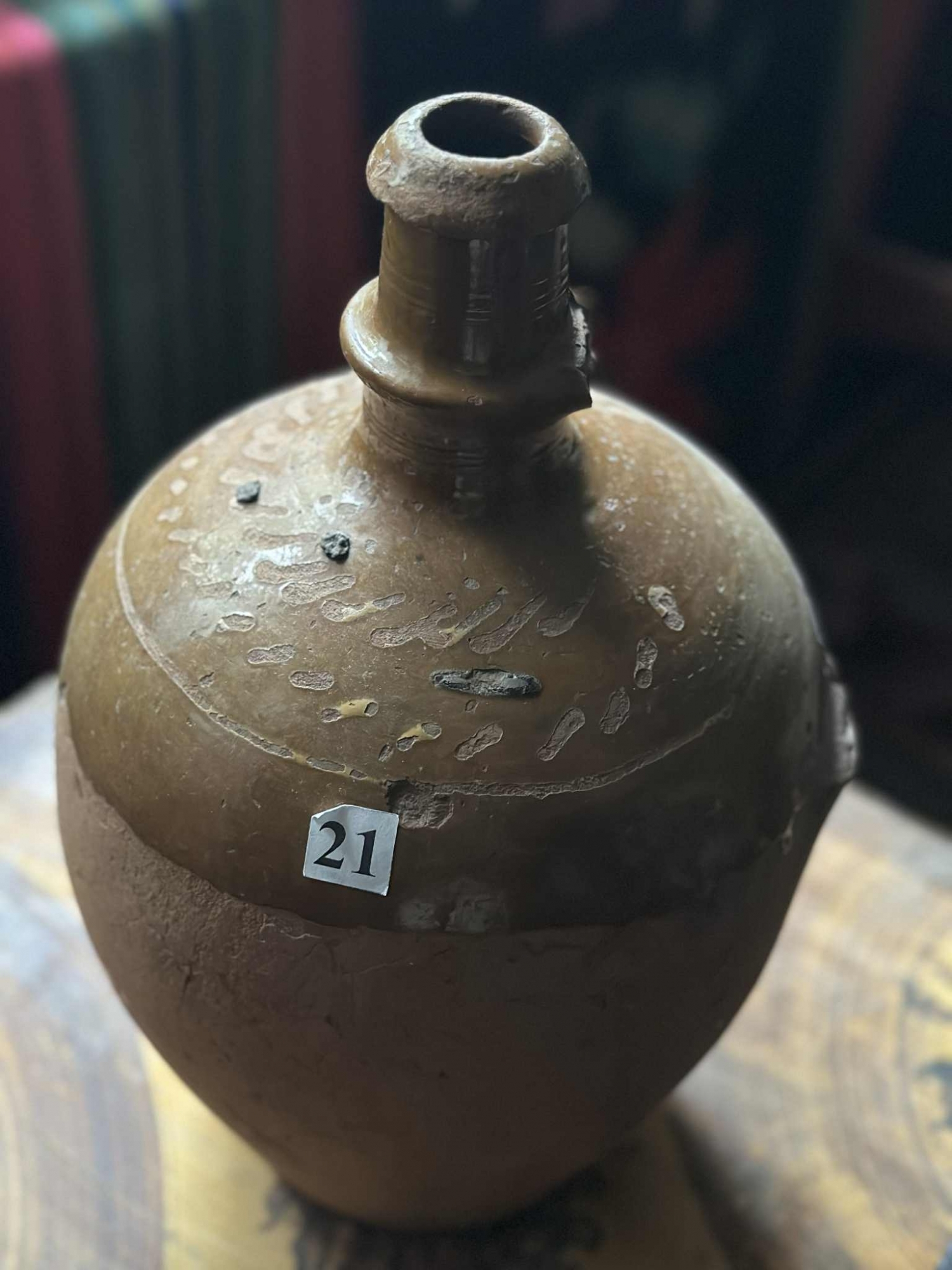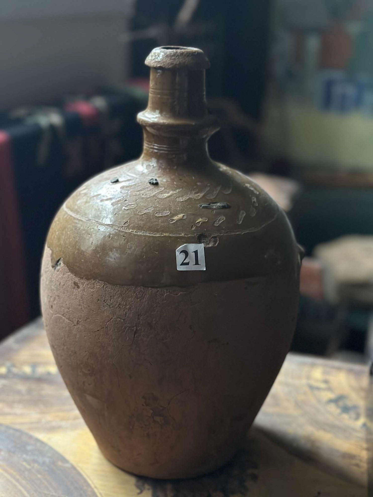 Vas ceramic de formă alungită, cu corp oval și gât îngust, terminat printr-un guler pronunțat. Partea superioară este acoperită cu smalț lucios brun-auriu, iar cea inferioară este nesmălțuită, de culoare brun-roșiatică. Pe suprafață se observă urme de uzură și mici defecte de ardere, specifice pieselor tradiționale utilitare. La baza gîtului are două rînduri de semne (picături), și o linie circulară după acestea.