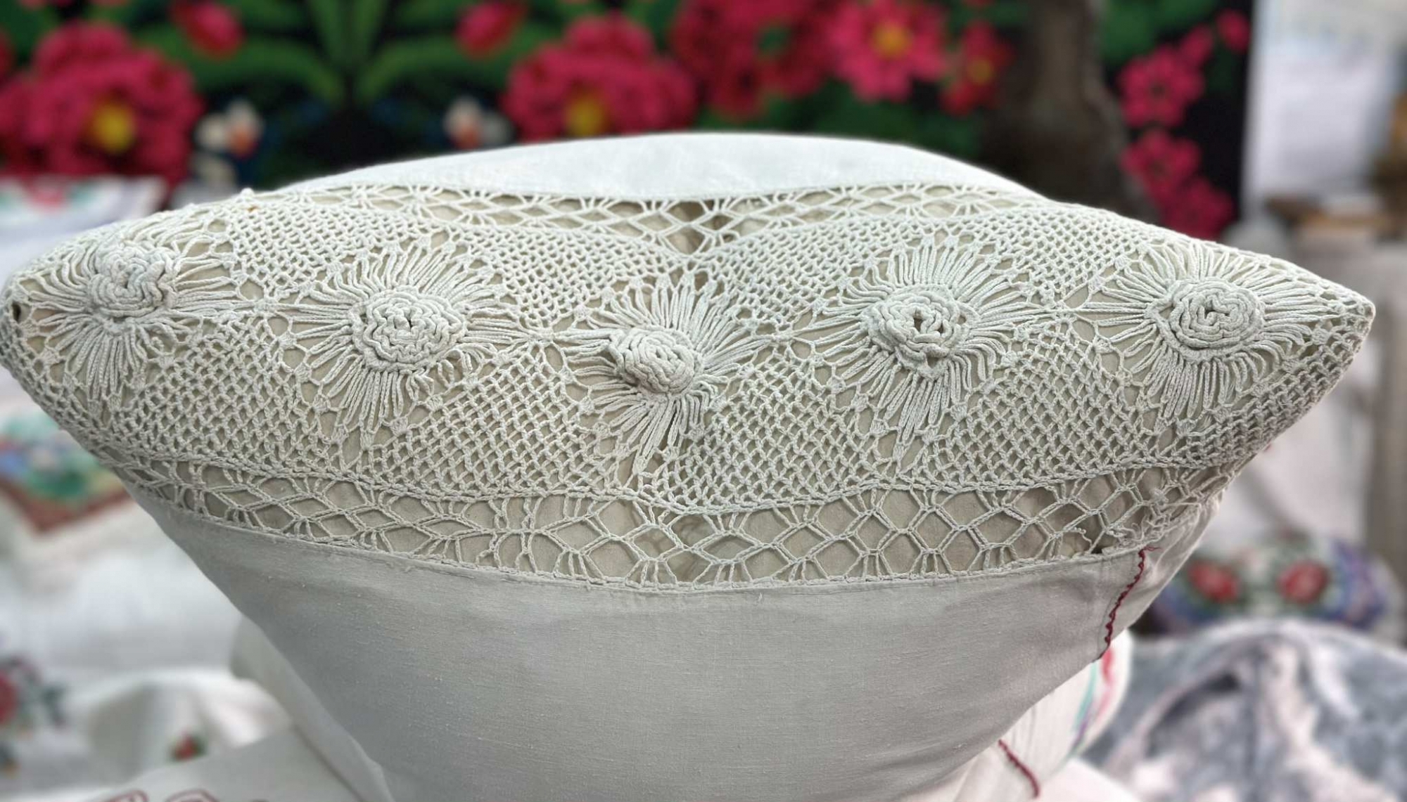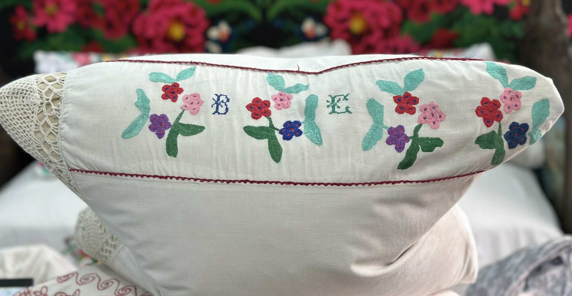 Țesătură tradițională la care broderia este dispusă pe centrul feței de pernă și prezintă un șir din patru buchețele de flori stilizate, lucrate cu fir colorat în nuanțe vii – roșu, roz, violet, albastru și verde –, simbolizând prospețimea, viața și frumusețea naturii. Florile sunt grupate simetric, flancând două inițiale brodate: „B” și „E”. Aceste litere, executate cu migală în punct de broderie fin, sugerează inițialele celor care au făcut parte dintr-o poveste de familie – poate o pereche de tineri îndrăgostiți sau un cuplu căsătorit. Astfel, obiectul capătă o dimensiune intimă, personalizată, ieșind din sfera producției anonime. Pe una dintre marginile laterale, fața de pernă este înfrumusețată cu inserții croșetate manual în forme romboidale și flori în centrul acestora. Acestea indică măiestria femeilor care, în trecut, învățau de timpuriu arta lucrului de mână și o foloseau pentru a înfrumuseța obiectele din casă, în special cele care alcătuiau zestrea. Linia de cusătură roșie care separă partea brodată de restul feței de pernă este discretă, dar atent executată, încadrând compoziția decorativă și dând unitate vizuală întregii lucrări.