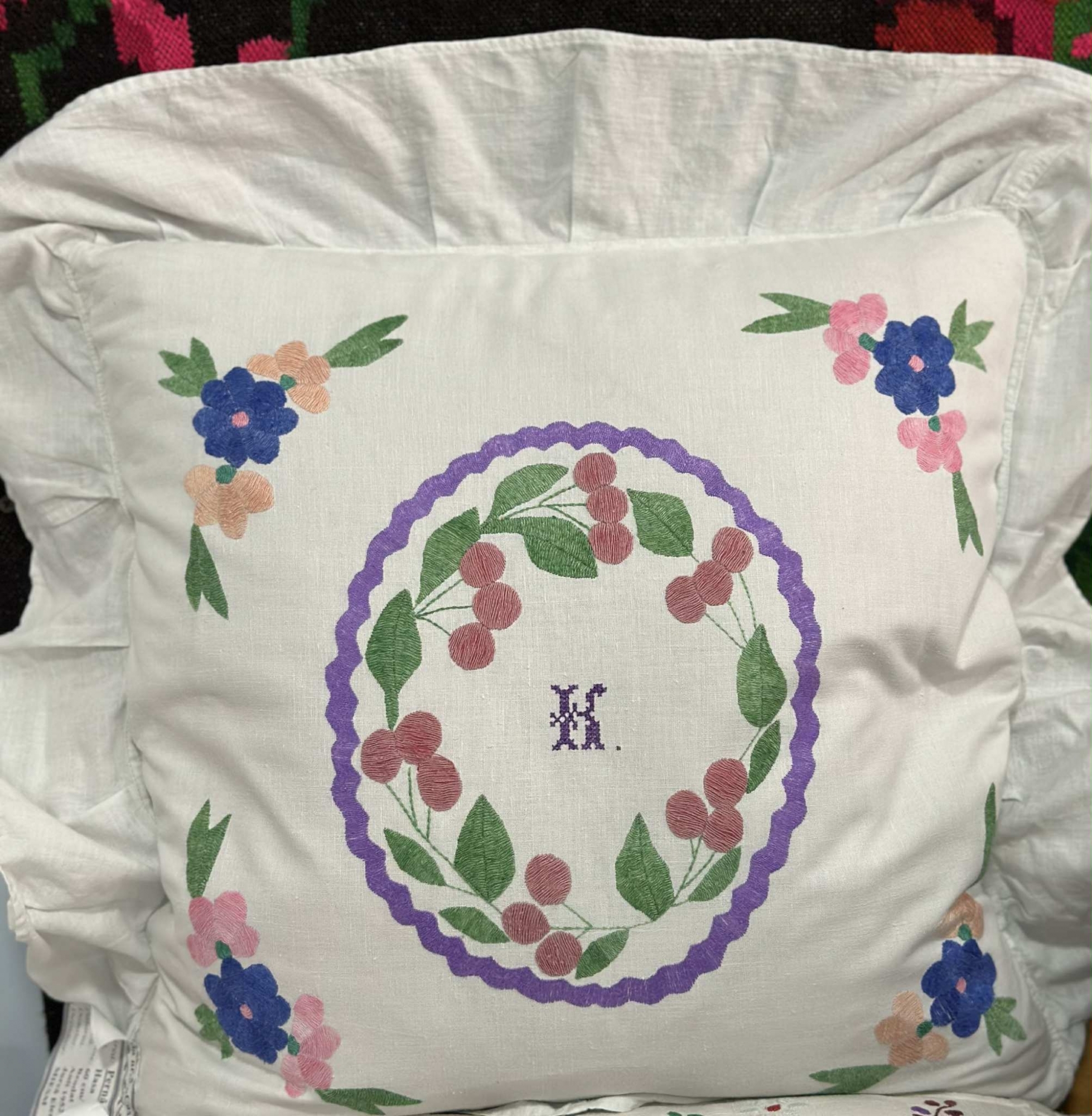 Față de pernă tradițională, de culoare albă, decorată manual prin broderie colorată. Modelul central reprezintă o coroană formată din frunze verzi și cireșe în nuanțe de rușu deschis, încadrată de un contur mov ondulat. În mijloc se află inițiala „K”, brodată cu ață de culoare mov. Colțurile feței de pernă sunt împodobite cu compoziții florale în tonuri de albastru și roz, completând armonios decorul.