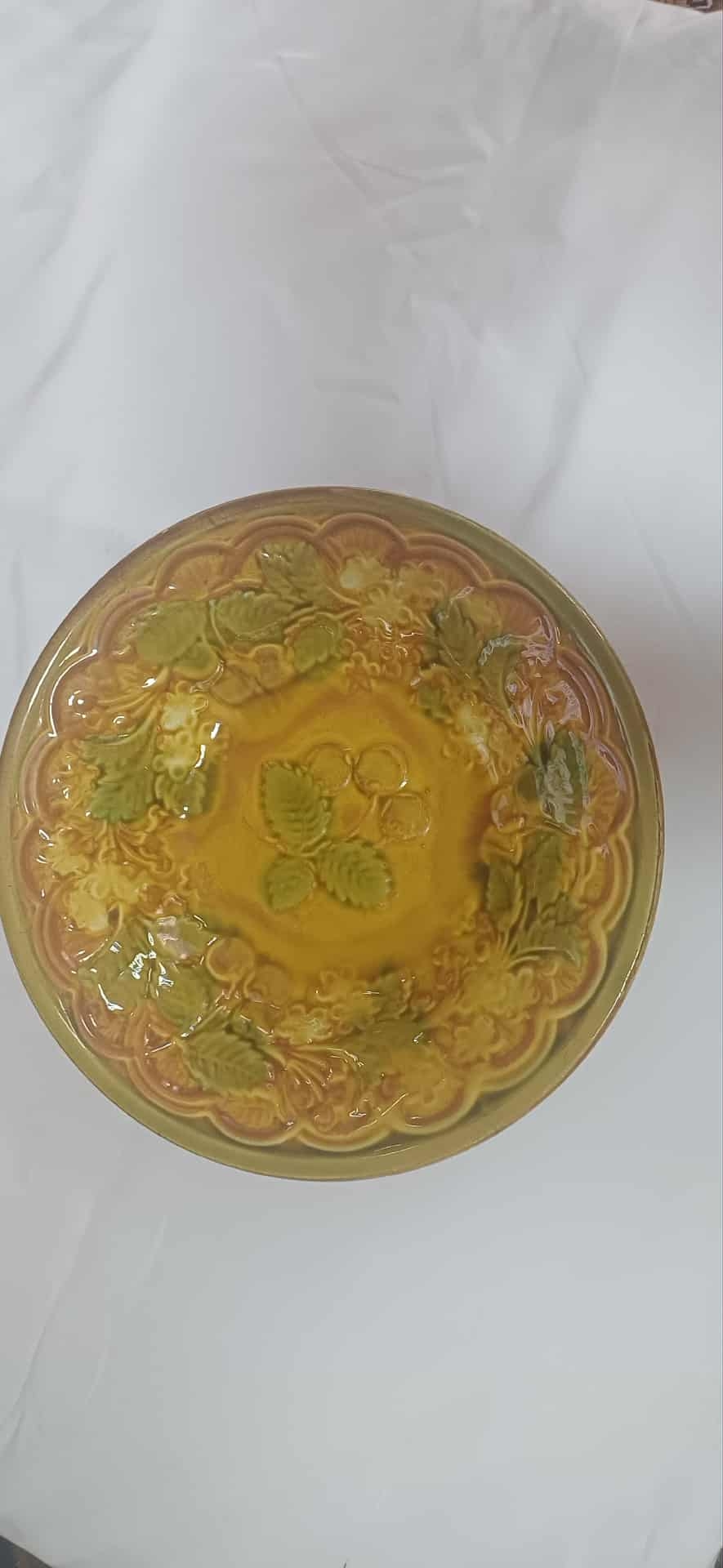 Farfurie de formă rotundă cu pereții groși și marginea rotungită acoperită cu glazura lucioasă în tonuri galben auriu și verde. Suprafața interioară este ornamentată în relief cu motive vegetale-frunze de cireș și cireșe redate într-o manieră plastică și expresivă.