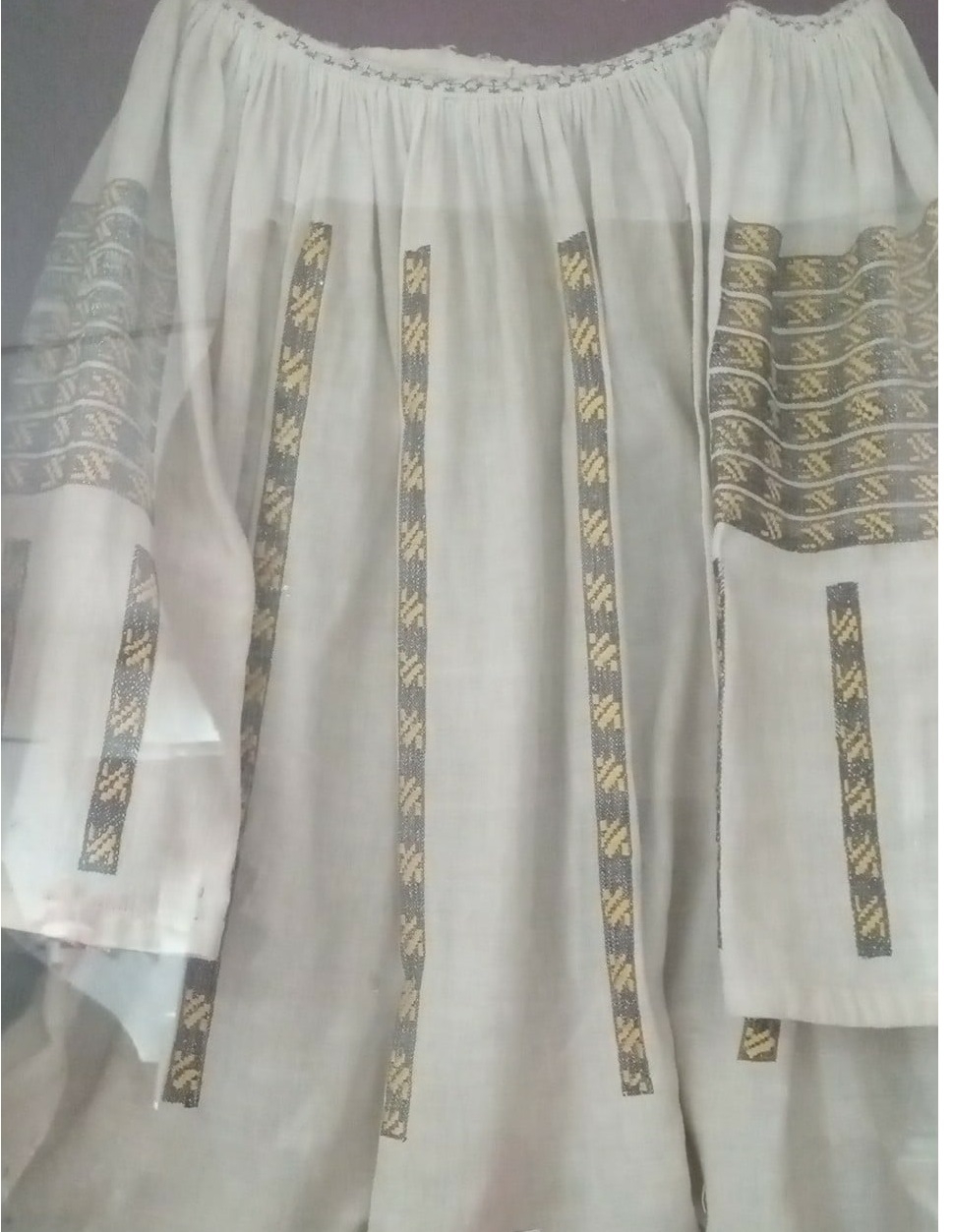 Piesa face parte din portul tradițional femeiesc specific spațiului românesc din zona centrală a Moldovei sau sud-estul Transilvaniei cu motive geometrice dispuse pe registre verticale .